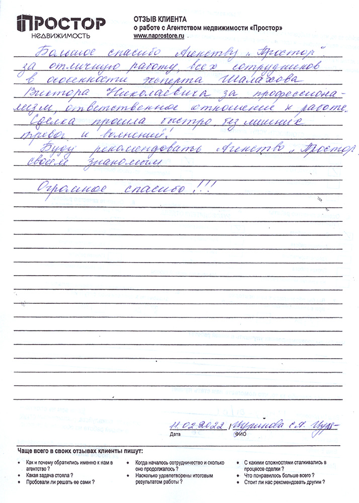 Ковалева В.А., продавецБольшое спасибо агентству "Простор" за отличную работу всех сотрудников в особенности эксперта Шалахова Виктора Николаевича за профессионализм, ответственное отношение к работе. Сделка прошла быстро без лишних тревог и волнений! Буду рекомендовать агентство "Простор" своим знакомым. Огромное спасибо!