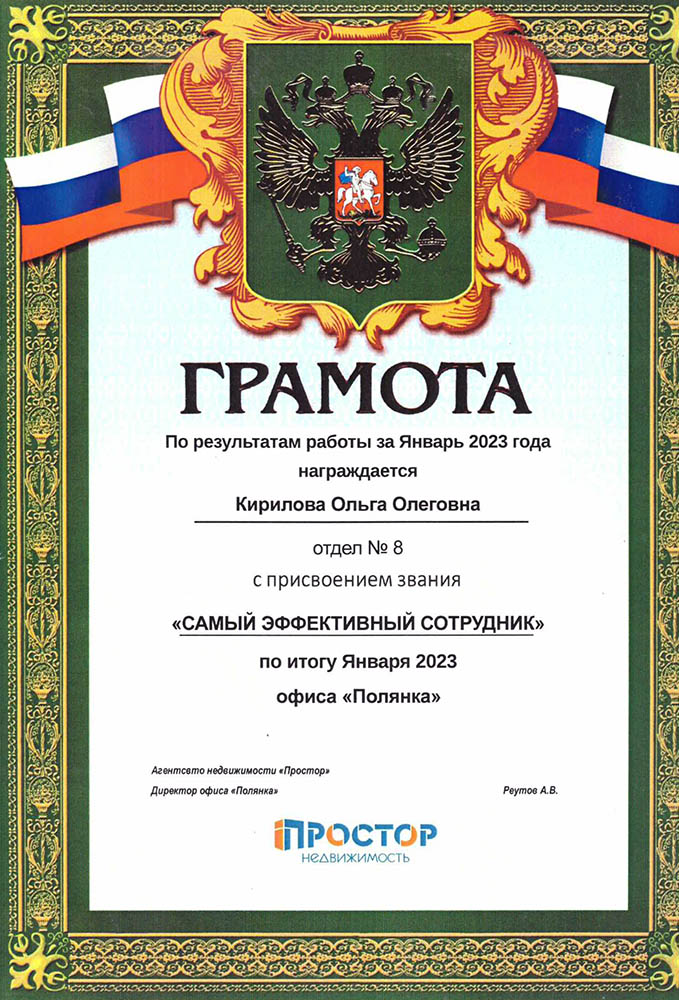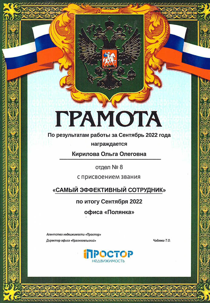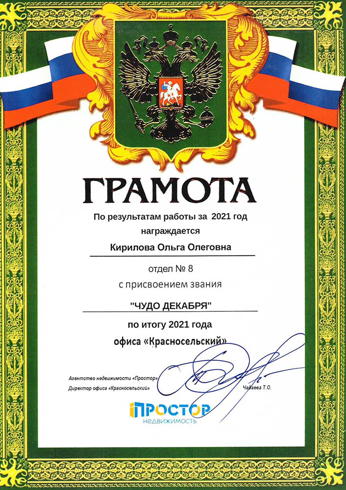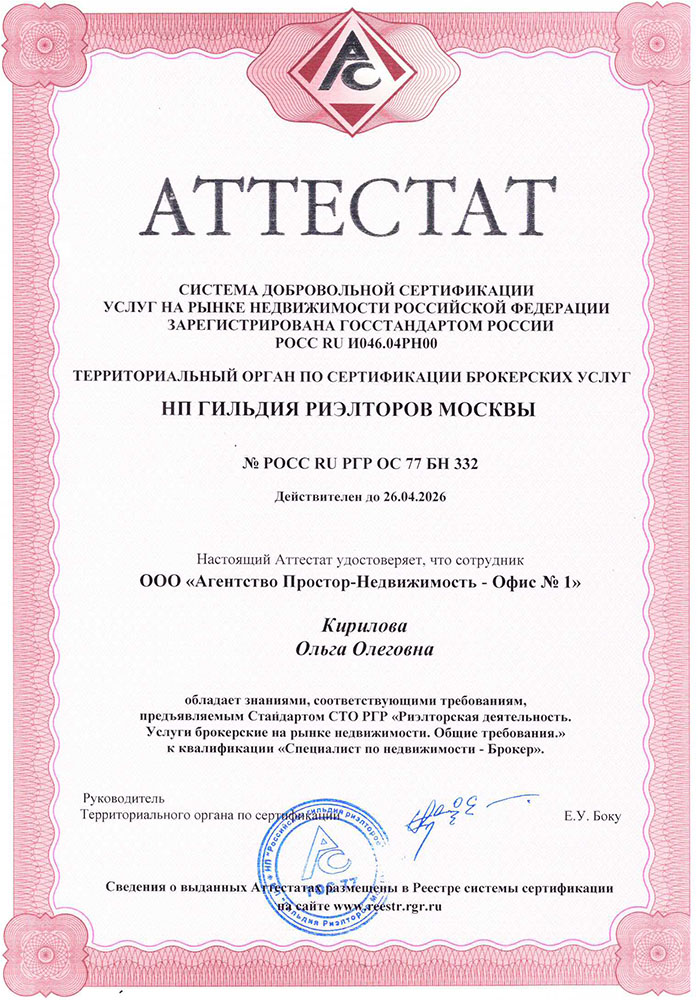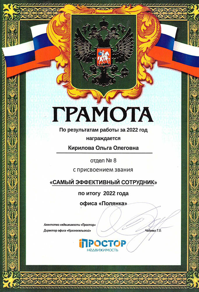 Добрый день! Просто не могу не написать и не оставить отзыв о работе вашего специалиста Кириловой Ольги. Мы провели с Ольгой две сделки по покупке двух квартир в течении полутора лет. Прежде всего хочу отметить личные качества сотрудника: высокая порядочность...