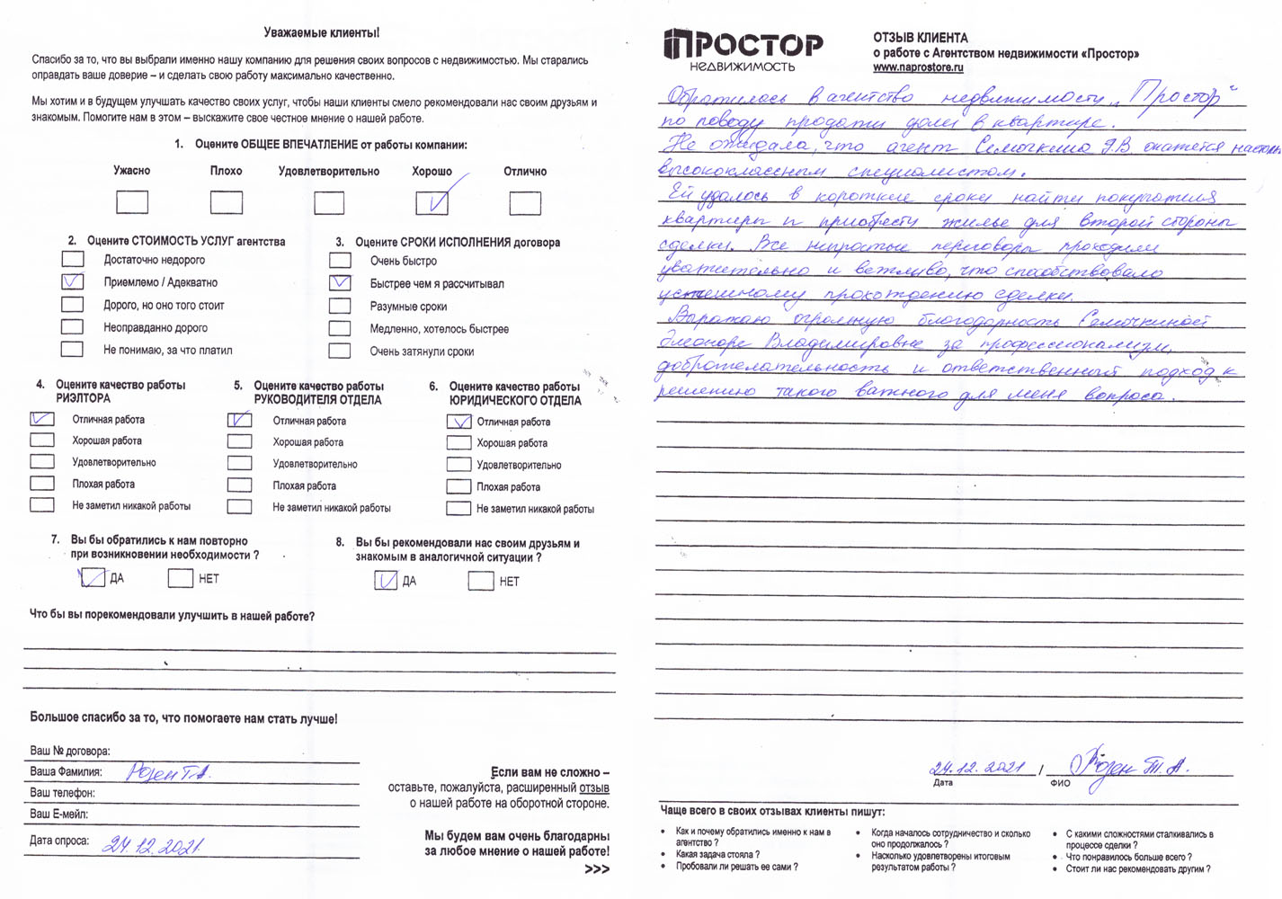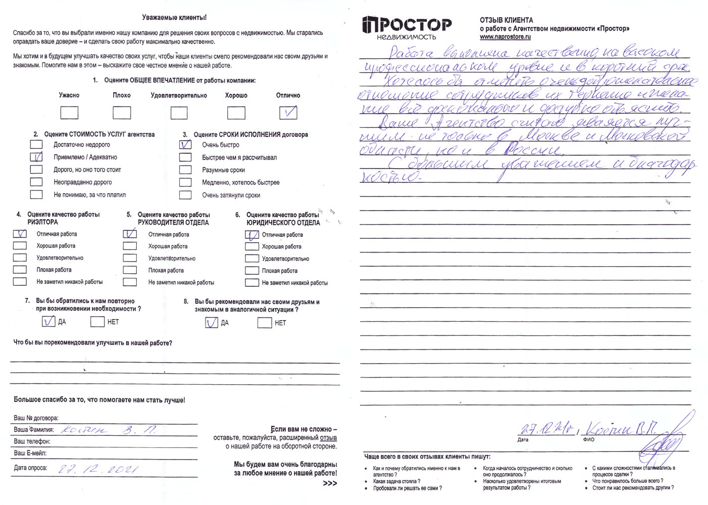 По рекомендации обратился в агентство недвижимости "Простор" с целью продажи квартиры в МО. Хочу поблагодарить сотрудников агентства Маркопольскую Евгению и Рыскину Надежду за отличную организацию процесса.