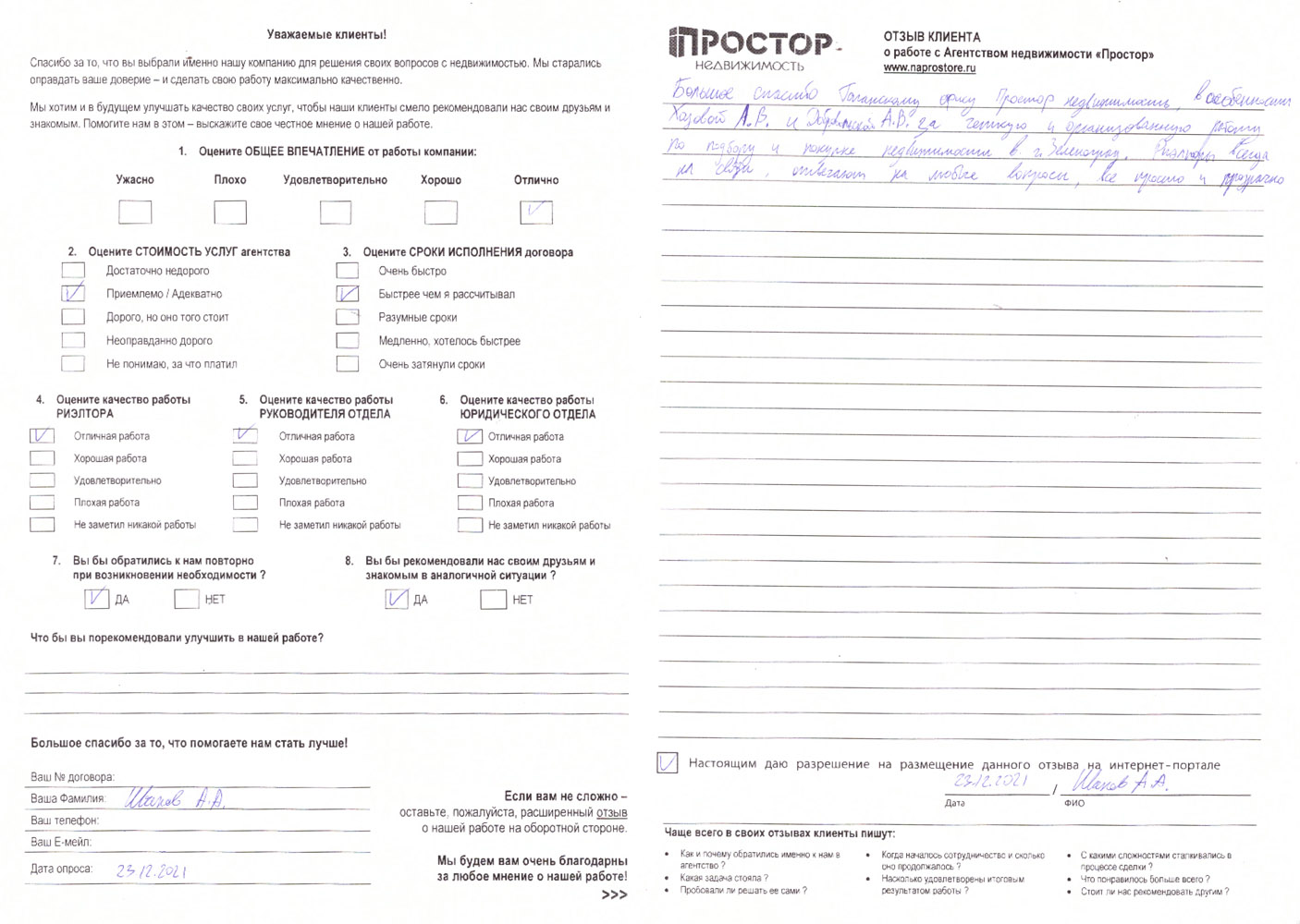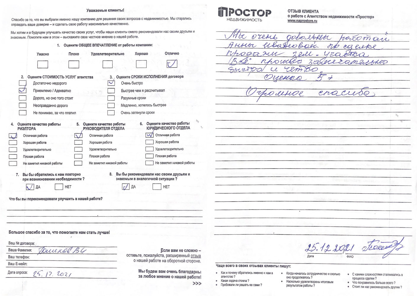 Повторно обратился к АН «Простор», снова все прошло хорошо и я доволен тем, как проходил весь процесс по продаже квартиры. Спасибо Ольге Меньшиковой и Юлии Рощикулиной за проведенную работу! Все прошло быстро, динамично и всегда в контакте по всем вопросам, отдельный большой плюс, что окончательная стоимость продажи получилась даже чуть больше предполагаемой сначала!