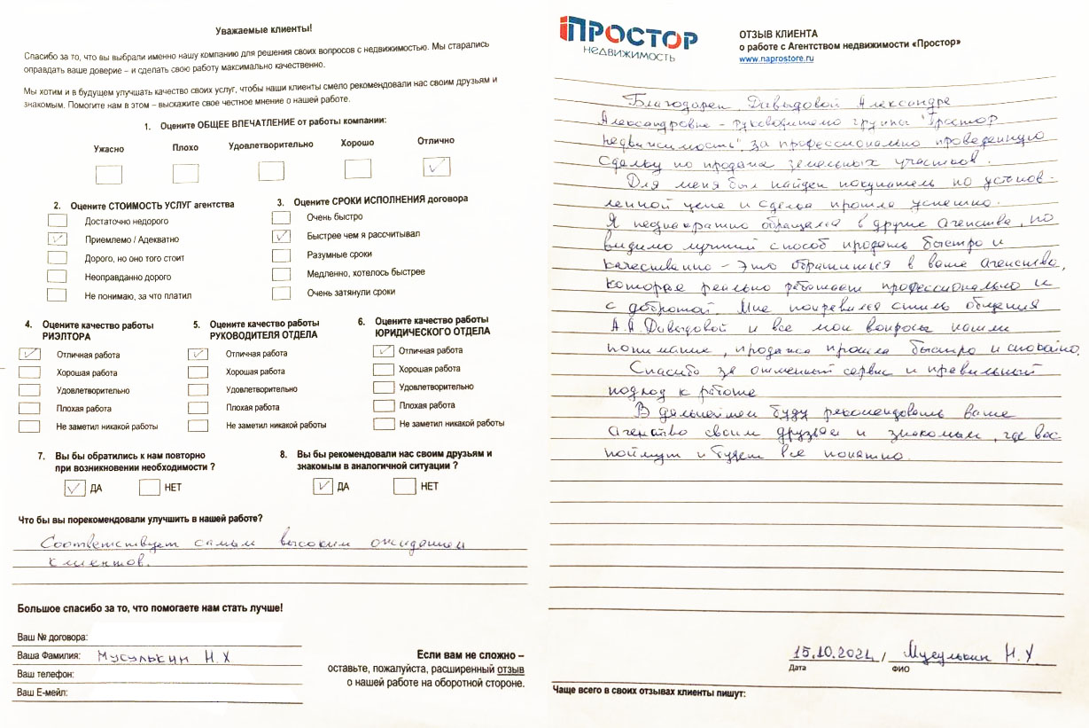 Благодарен Давыдовой Александре Александровне – руководителю группы «Простор недвижимость», за профессионально проведенную сделку по продаже земельных участков. Для меня был найден покупатель по установленной цене и сделка прошла успешно. Я неоднократно обращался в другие агентства, но видимо лучший способ продать быстро и качественно – это обратиться в ваше агентство, которое реально работает профессионально и с добротой. Мне понравился стиль общения А.А. Давыдовой, и все мои вопросы нашли понимание, продажа прошла быстро и спокойно. Спасибо за отменный сервис и правильный подход к работе. В дальнейшем буду рекомендовать ваше агентство своим друзьям и знакомым, где вас поймут и будет все понятно.