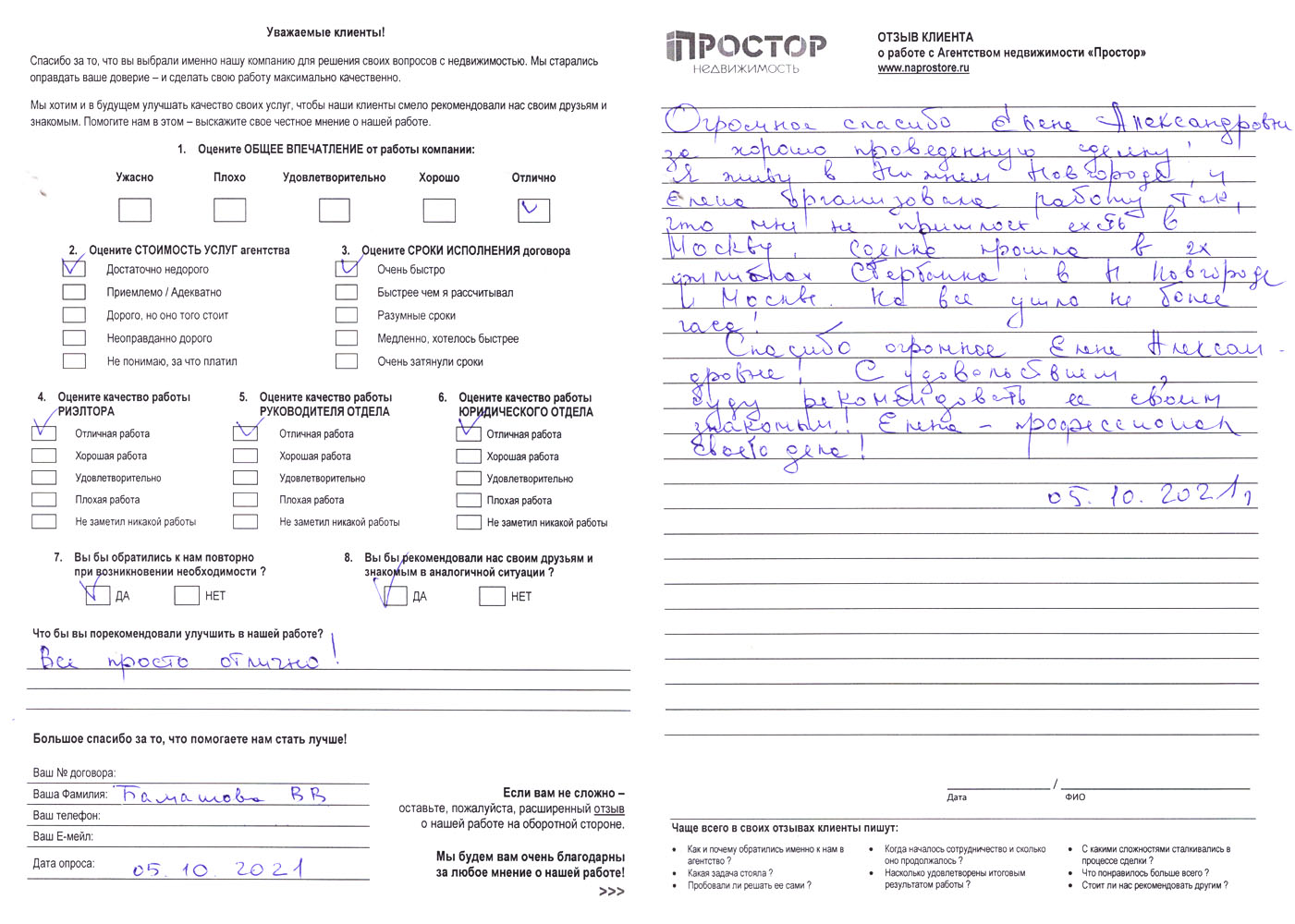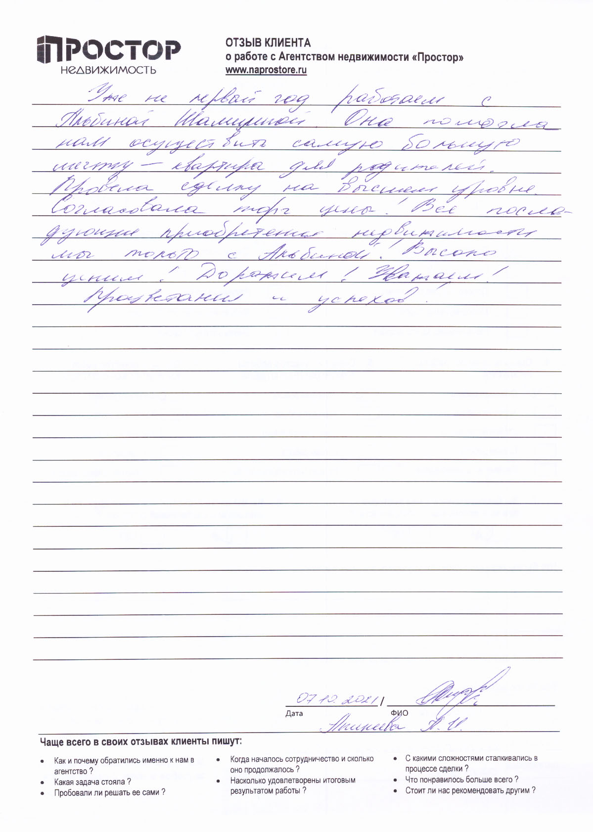 По рекомендации обратился в агентство недвижимости "Простор" с целью продажи квартиры в МО. Хочу поблагодарить сотрудников агентства Маркопольскую Евгению и Рыскину Надежду за отличную организацию процесса.