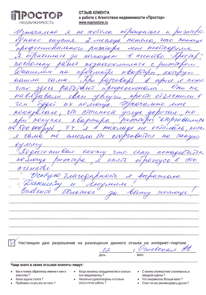 Изначально я не хотела обращаться к риэлторам, однако спустя два месяца поняла, что помощь профессионального риэлтора мне необходима. Я обратилась за помощью в агентство «Простор», поскольку ранее познакомилась с риэлтором Даниилом на просмотре квартиры, которую нашла сама. При разговоре в офисе я поняла, что здесь работают профессионалы. Изначально мне показалось, что стоимость услуг дорогая, но при покупке квартиры, риэлторы сторговались на пятьсот тысяч рублей, так что я в накладе не осталась, поскольку я сама не смогла бы сторговаться на такую сумму. Особую благодарность я выражаю Даниилу и Людмиле! Подытоживая скажу, что если понадобится помощь риэлтора, я опять обращусь в это агентство. Спасибо большое за вашу помощь!