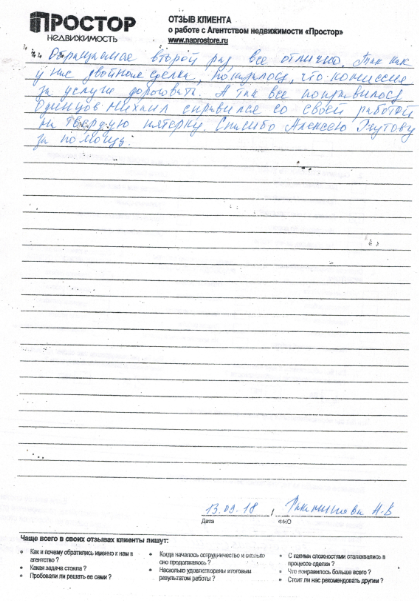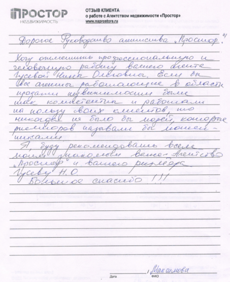 Дорогое руководство агентства «Простор». Хочу отметить профессионализм и человечную работу вашего агента Гусевой Нины Олеговны. Если бы все агенты работающие в области продажи недвижимости были так компетентны и работали на пользу своих клиентов, то никогда не было бы людей, которые риэлторов называли бы мошенниками. Я, буду рекомендовать всем моим знакомым ваше Агентство «Простор» и вашего риэлтора Гусеву Нину Олеговну. Большое спасибо!!!