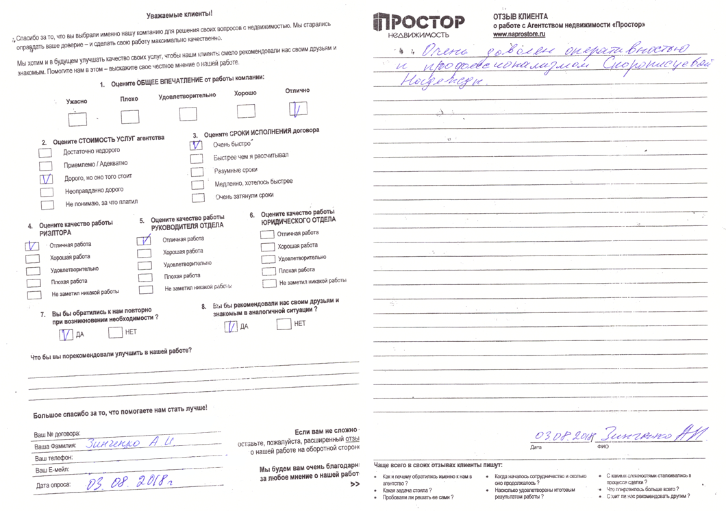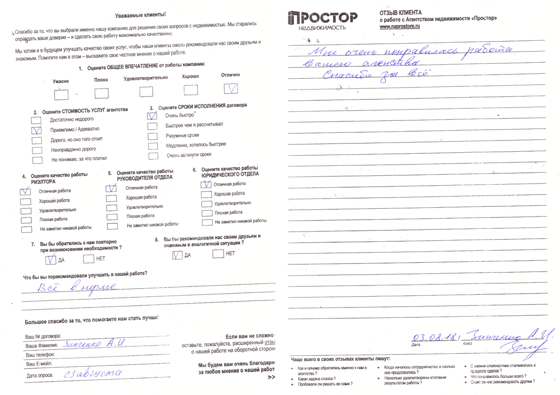 Я, Атаян Нонна Николаевна, являюсь клиентом агентства «Простор», работаем с агентом Ольгой Меньшиковой. Спасибо Вам огромное за четкую и оперативную работу. Вопрос решили четко; с оформлением справились также оперативно. Были учтены все наши пожелания и возможности. Рекомендую всем такого чуткого и отзывчивого сотрудника. Обязательно буду рекомендовать всем своим близким и знакомым. Изначально я сомневалась, что вообще это реально и возможно, так как были некоторые сложности с нашей стороны, а Ольга все так четко и конструктивно объяснила, а также просто вселила надежду, и всё получилось, в общем сделала невозможное возможным. Спасибо Вам огромное!!!
