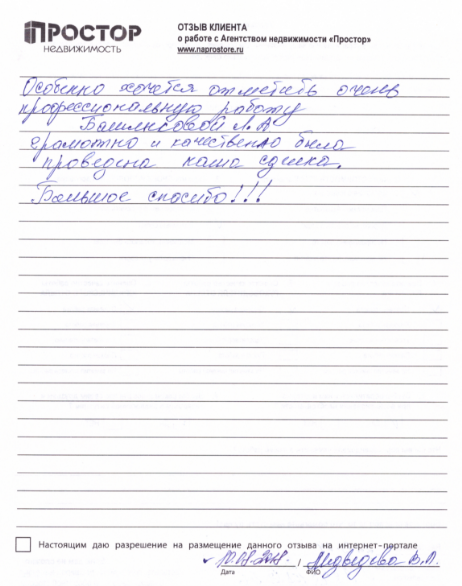 Особенно хочется отметить очень профессиональную работу Башлыковой Л.А., грамотно и качественно была проведена наша сделка. Большое спасибо!