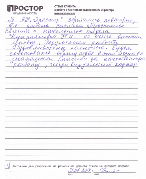 В АН "Простор" обратились повторно, т.к. работа риэлтора Трофимова Евгения и начальника отдела Куприяновой Н.И. на очень высоком уровне. Результатом работы удовлетворены полностью. Будем советовать обращаться в это агентство знакомым. Спасибо за качественную работу, индивидуальный подход.