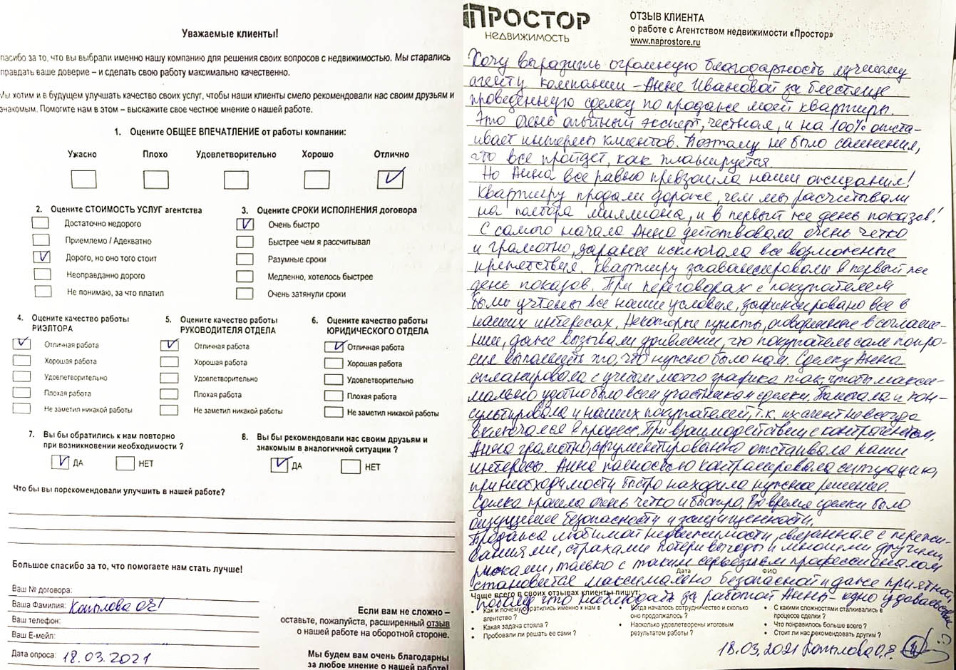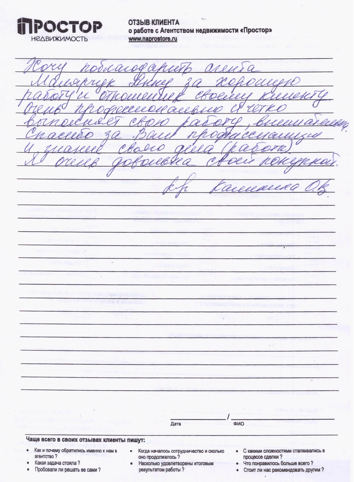 По рекомендации обратился в агентство недвижимости "Простор" с целью продажи квартиры в МО. Хочу поблагодарить сотрудников агентства Маркопольскую Евгению и Рыскину Надежду за отличную организацию процесса.