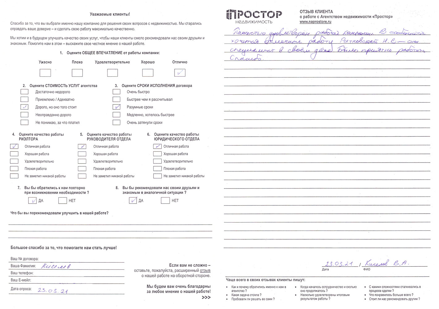 Полностью удовлетворен работой компании. В особенности хочется отметить работу Ратновской Н.В. - она специалист в своем деле. Было приятно работать. Спасибо!