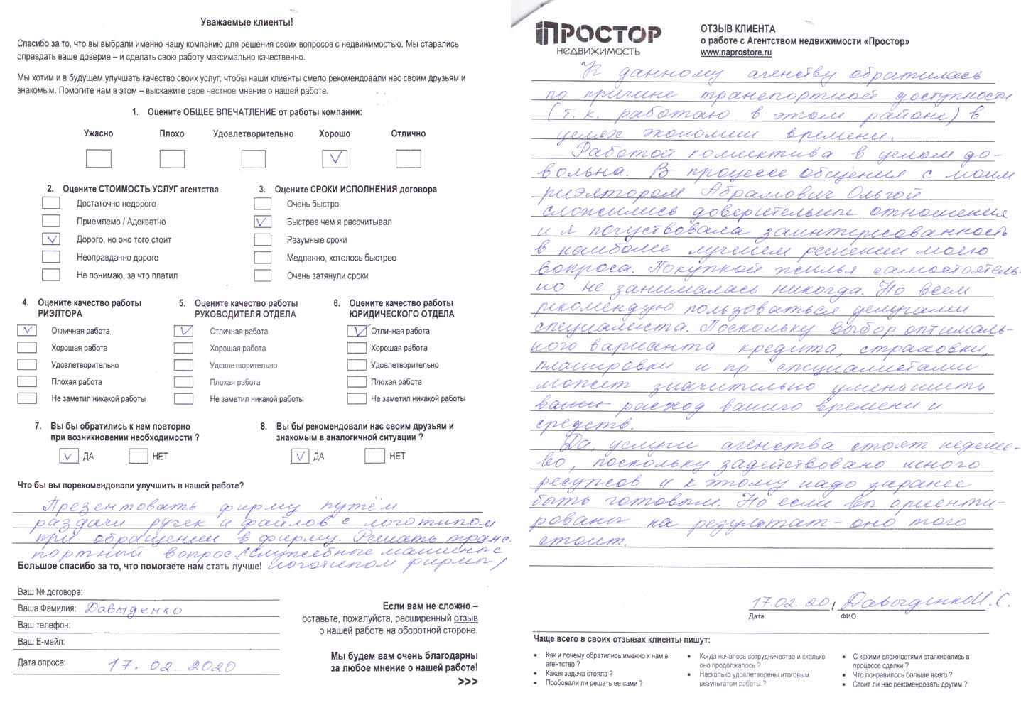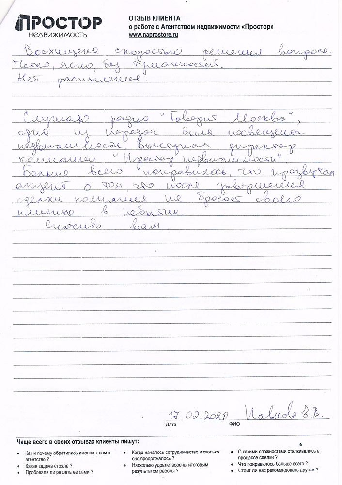 Восхищение скоростью решения вопроса. Все четко, ясно, без туманностей. Нет распыления. Слушаю радио "Говорит Москва", одна из передач была посвящена недвижимости, выступал директор компании "Простор Недвижимость". Больше всего понравилось, что прозвучал акцент о том, что после завершения сделки компания не бросает своего клиента в небытие. Спасибо вам!