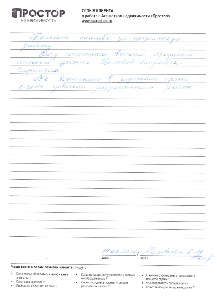 Я, Атаян Нонна Николаевна, являюсь клиентом агентства «Простор», работаем с агентом Ольгой Меньшиковой. Спасибо Вам огромное за четкую и оперативную работу. Вопрос решили четко; с оформлением справились также оперативно. Были учтены все наши пожелания и возможности. Рекомендую всем такого чуткого и отзывчивого сотрудника. Обязательно буду рекомендовать всем своим близким и знакомым. Изначально я сомневалась, что вообще это реально и возможно, так как были некоторые сложности с нашей стороны, а Ольга все так четко и конструктивно объяснила, а также просто вселила надежду, и всё получилось, в общем сделала невозможное возможным. Спасибо Вам огромное!!!