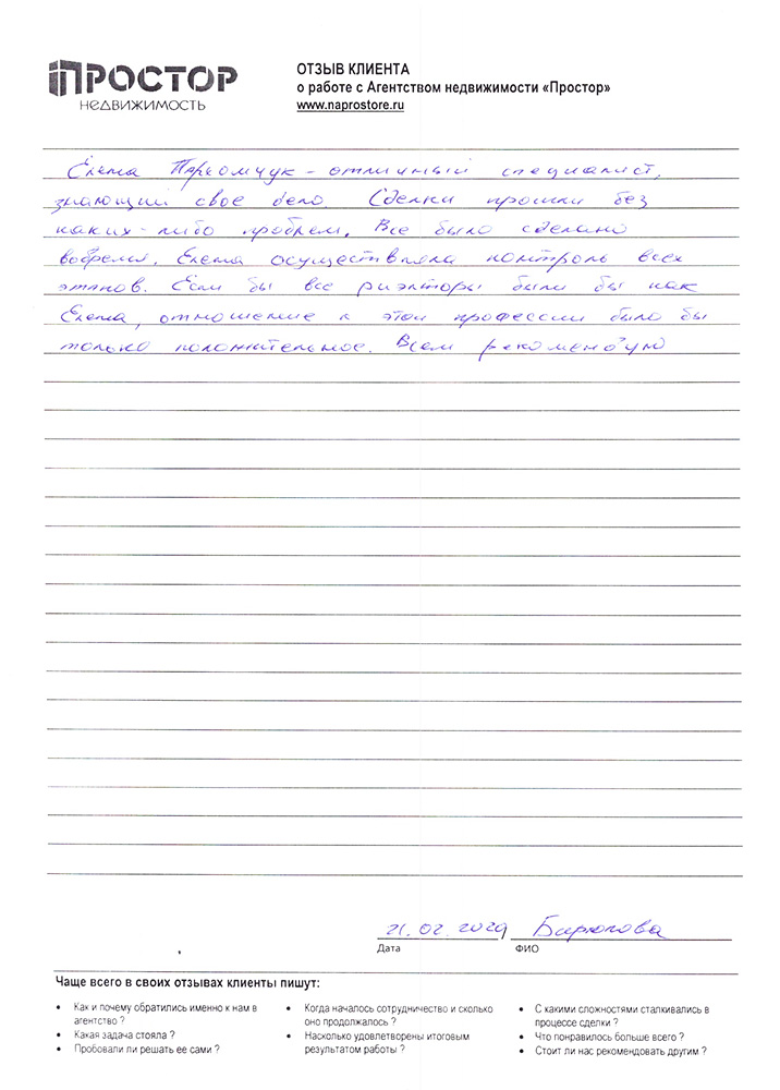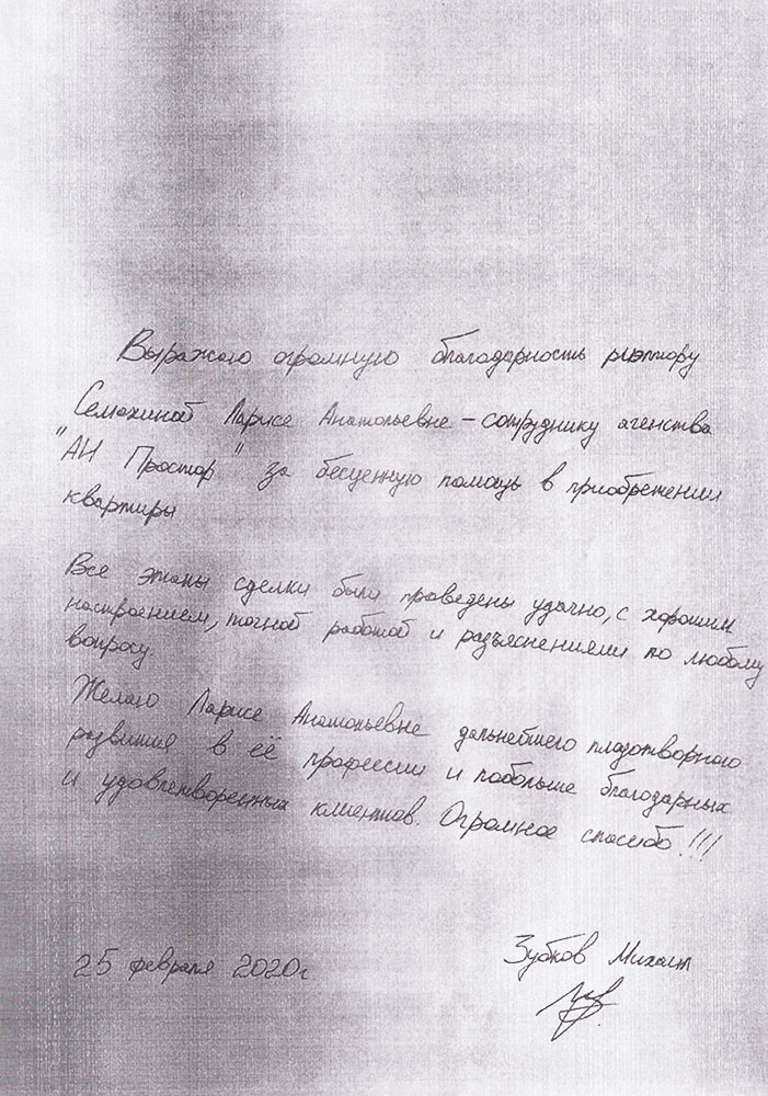 Выражаю огромную благодарность риэлтору Семахиной Ларисе Анатольевне - сотруднику агентства АН "Простор" за бесценную помощь в приобретении квартиры. Все этапы сделки были проведены удачно, с хорошим настроением, точной работой и разъяснениями по любому вопросу. Желаю Ларисе Анатольевне дальнейшего плодотворного развития в ее профессии и побольше благодарных и удовлетворенных клиентов. Огромное спасибо!