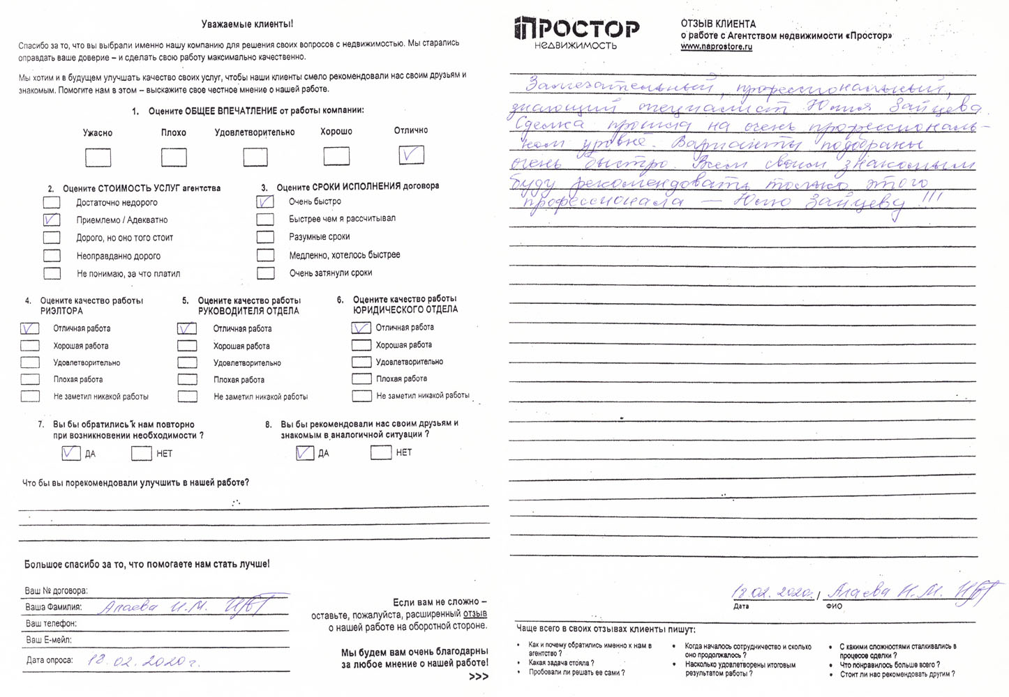 Хочу выразить глубокую признательность риэлтору агентства "Простор" Андрею Молканову за его профессионализм и чуткий подход к решению нашего вопроса. Мы с дочерью искали жильё в Подмосковье в очень бюджетную сумму, и в пределах 50 км от МКАД. Случайно узнали о риэлторе Молканове Андрее по отзывам попутчиков такси. Начитавшись плохих отзывов об агентстве в интернете, с опаской пришли в Центральный офис к Андрею. Но пообщавшись с ним, наши сомнения были развеяны. Андрей Николаевич помог сориентироваться в возможности такой покупки и довольно быстро, через 2 месяца после обращения нашёл нам однокомнатную квартиру в 35 км от Москвы, с хорошей транспортной развязкой. Сделка прошла быстро, были учтены наши пожелания, в том числе и порядок оплаты за риэторские услуги. Мы довольны оказанными услугами и будем рекомендовать обращаться именно к Молканову Андрею Николаевичу, а также в дальнейшем пользоваться его услугами. Спасибо за качественную работу и грамотное сопровождение на протяжении всего сотрудничества и даже после сделки!!!
