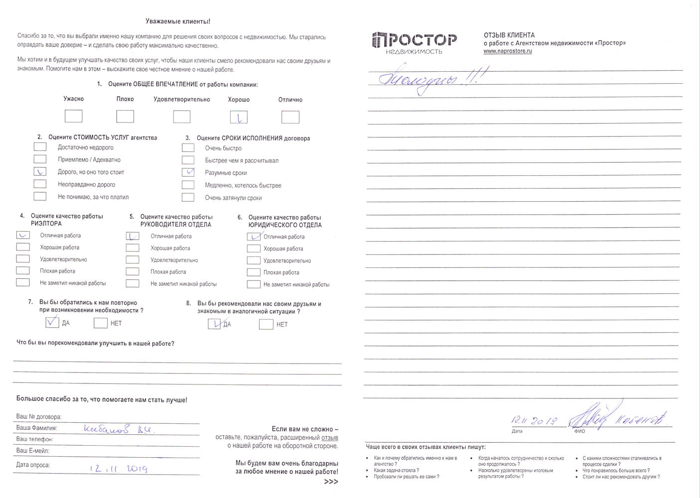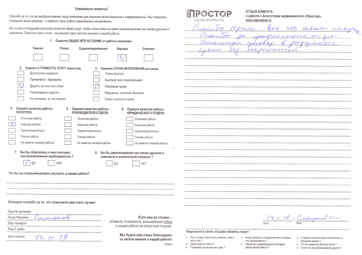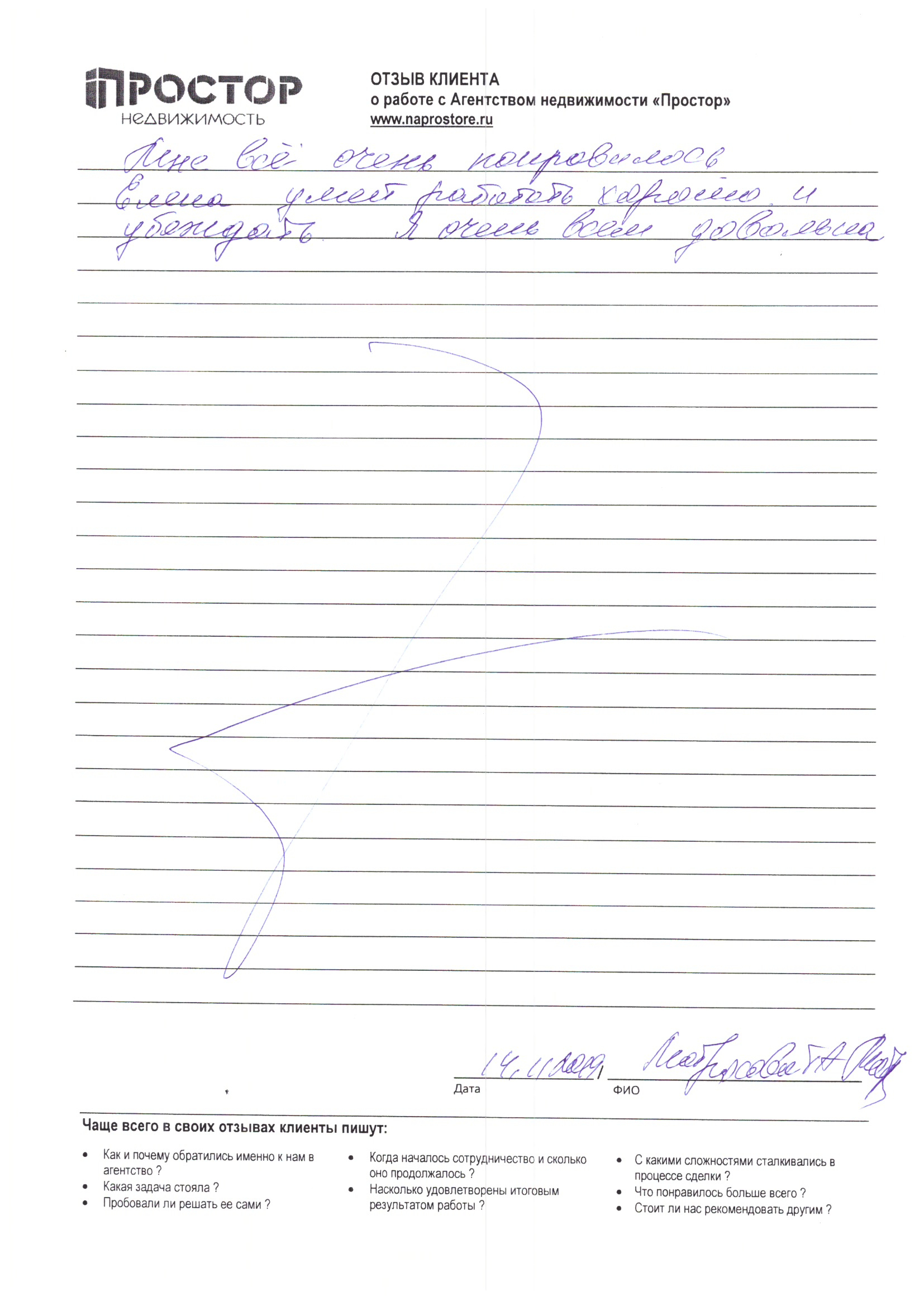 По рекомендации обратился в агентство недвижимости "Простор" с целью продажи квартиры в МО. Хочу поблагодарить сотрудников агентства Маркопольскую Евгению и Рыскину Надежду за отличную организацию процесса.