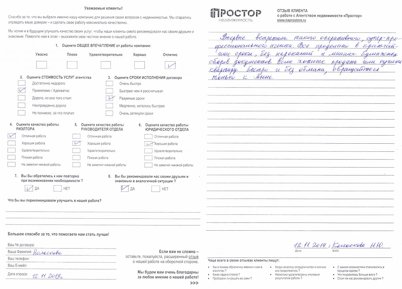 Я, Атаян Нонна Николаевна, являюсь клиентом агентства «Простор», работаем с агентом Ольгой Меньшиковой. Спасибо Вам огромное за четкую и оперативную работу. Вопрос решили четко; с оформлением справились также оперативно. Были учтены все наши пожелания и возможности. Рекомендую всем такого чуткого и отзывчивого сотрудника. Обязательно буду рекомендовать всем своим близким и знакомым. Изначально я сомневалась, что вообще это реально и возможно, так как были некоторые сложности с нашей стороны, а Ольга все так четко и конструктивно объяснила, а также просто вселила надежду, и всё получилось, в общем сделала невозможное возможным. Спасибо Вам огромное!!!