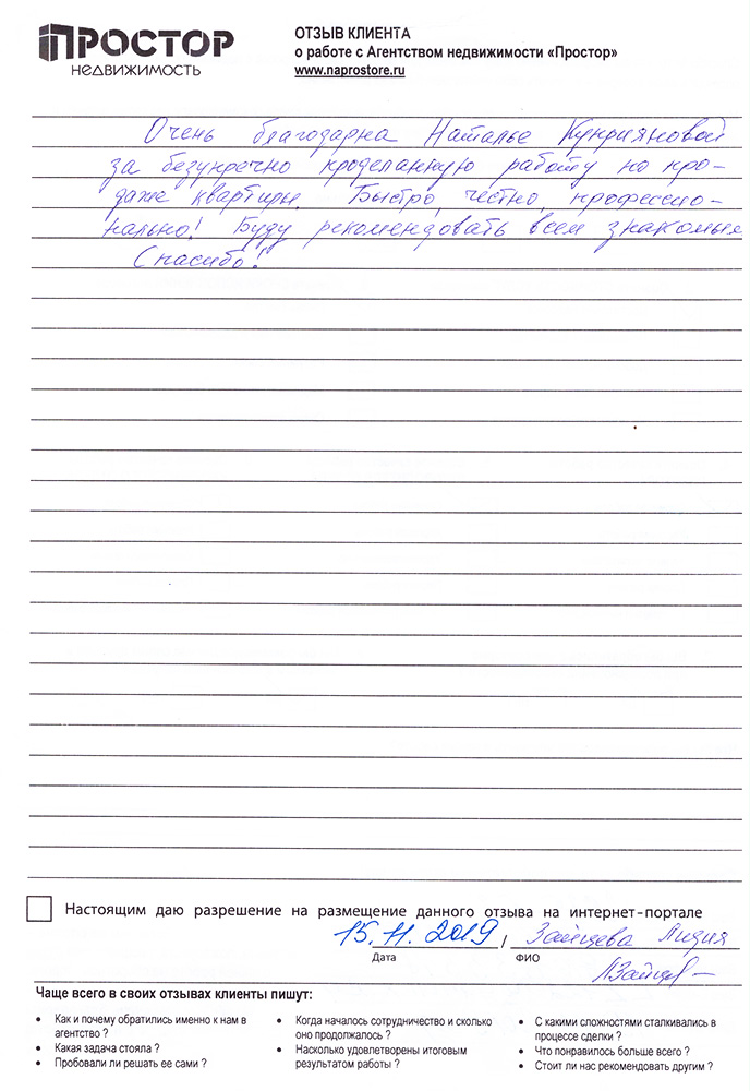 Очень благодарна Наталье Куприяновой за безупречно проделанную работу по продаже квартиры. Быстро, честно, профессионально! Буду рекомендовать всем знакомым. Спасибо!