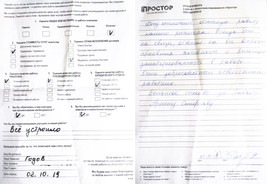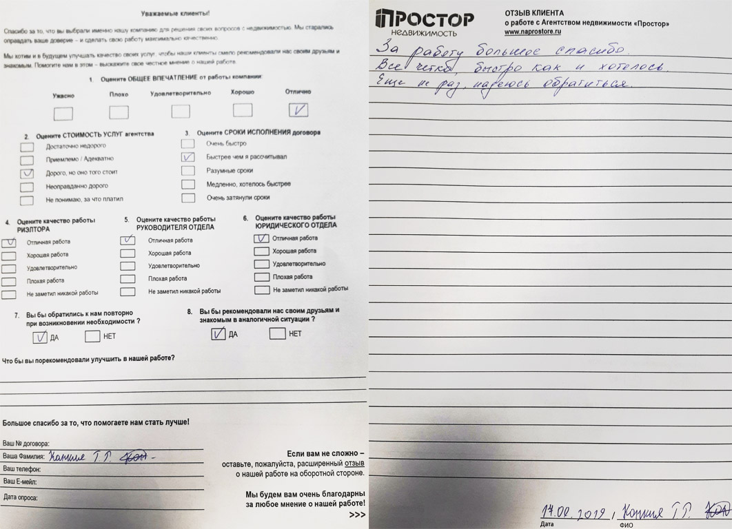 Повторно обратился к АН «Простор», снова все прошло хорошо и я доволен тем, как проходил весь процесс по продаже квартиры. Спасибо Ольге Меньшиковой и Юлии Рощикулиной за проведенную работу! Все прошло быстро, динамично и всегда в контакте по всем вопросам, отдельный большой плюс, что окончательная стоимость продажи получилась даже чуть больше предполагаемой сначала!