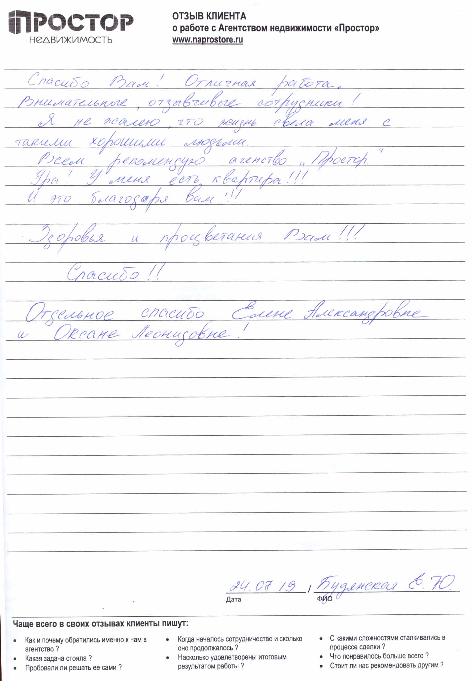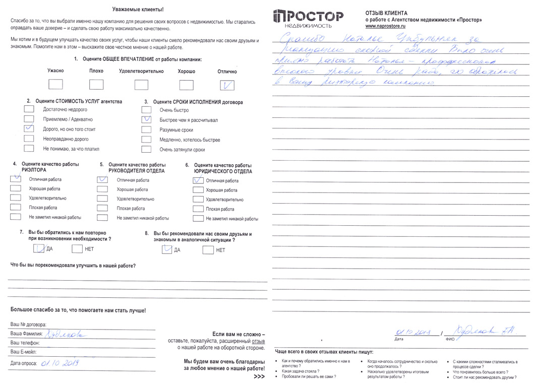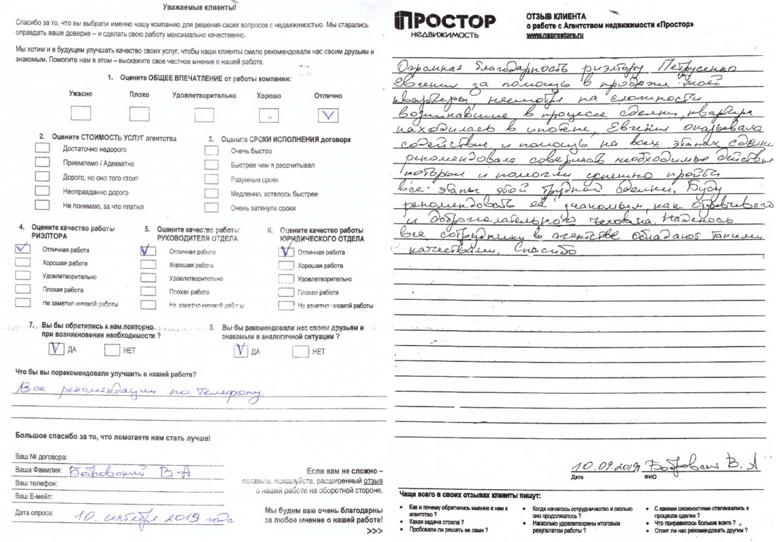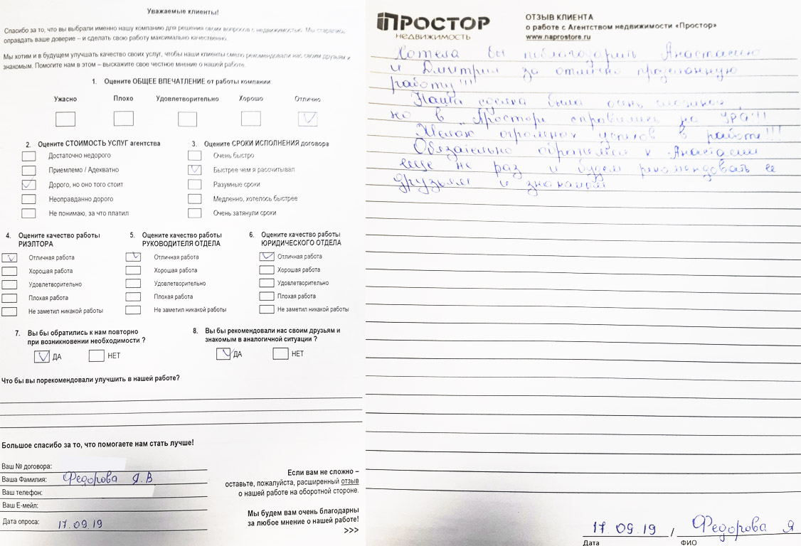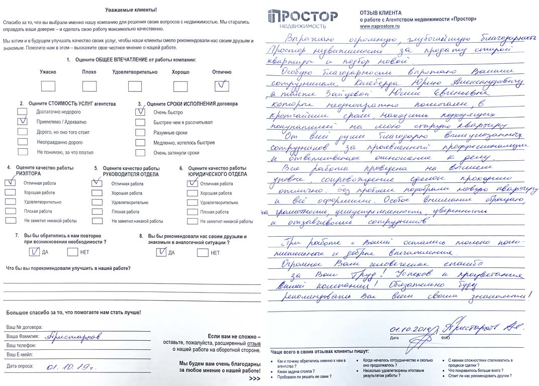Выражаю огромную, глубочайшую благодарность"Простор недвижимость" за продажу старой квартиры и подбор новой. Особую благодарность выражаю Вашим сотрудникам Келеберда Юрию Александровичу, а также Зайцевой Юлии Евгеньевне, которые неоднократно помогали, в кротчайшие сроки, находить подходящих покупателей на мою старую квартиру. От всей души благодарю вышеуказанных сотрудников за проявленный профессионализм и ответственное отношение к делу. Вся работа проведена на высшем уровне, сопровождение сделок проходило отлично. Без проблем подобрали новую квартиру и все оформили. Особое внимание обращаю на грамотность, целеустремленность, уверенность и отзывчивость сотрудников. При работе с Вами остались только положительные и добрые впечатления. Огромное Вам человеческое спасибо за Ваш труд! Успехов и процветания Вашей компании! Обязательно буду рекомендовать Вас всем своим знакомым!