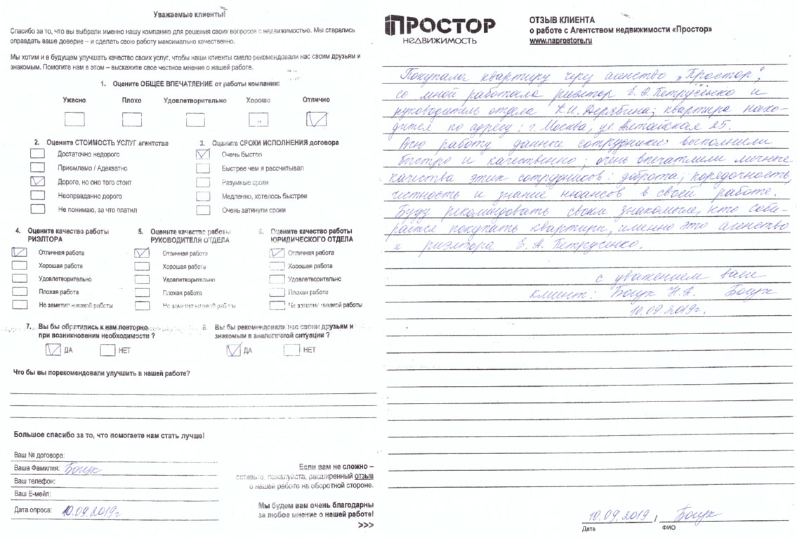 Покупала квартиру через агентство «Простор», со мной работала риэлтор Е.А. Петрусенко и руководитель отдела К.И. Дерябина; квартира находится по адресу: г. Москва, ул. Алтайская 25. Всю работу данные сотрудники выполнили быстро и качественно; очень впечатлили личные качества этих сотрудников: доброта, порядочность, честность и знание нюансов в своей работе. Буду рекомендовать своим знакомым, кто собирается покупать квартиры, именно это агентство и риэлтора Е.А. Петрусенко.