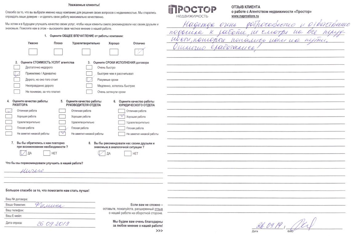 По рекомендации обратился в агентство недвижимости "Простор" с целью продажи квартиры в МО. Хочу поблагодарить сотрудников агентства Маркопольскую Евгению и Рыскину Надежду за отличную организацию процесса.