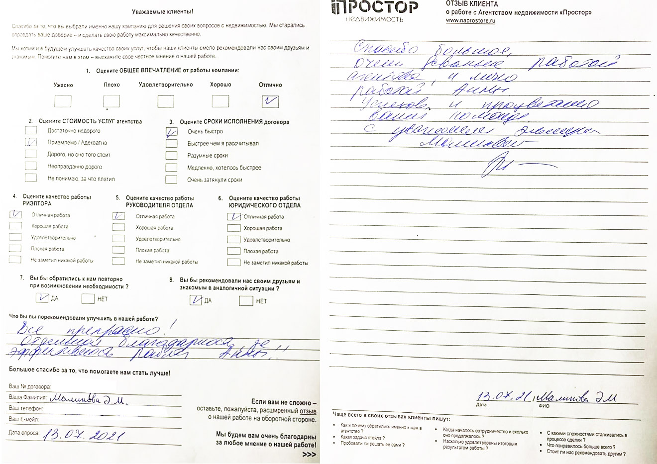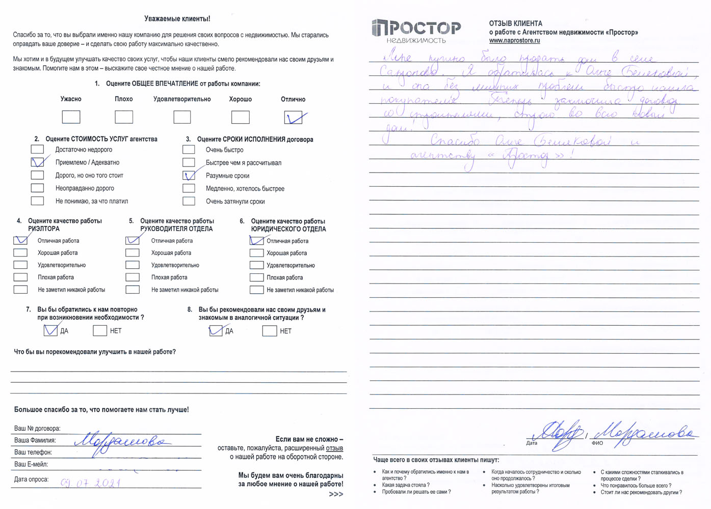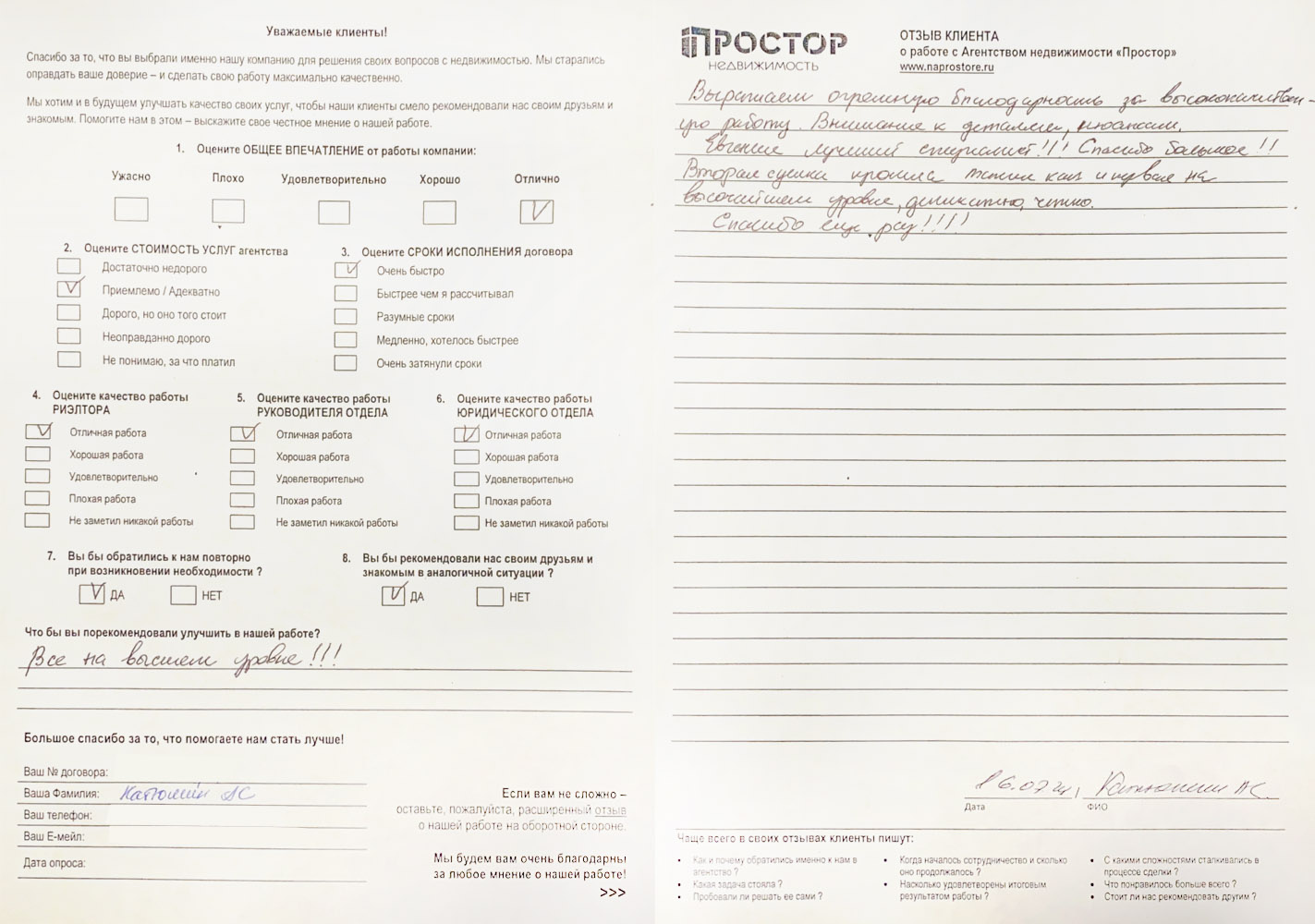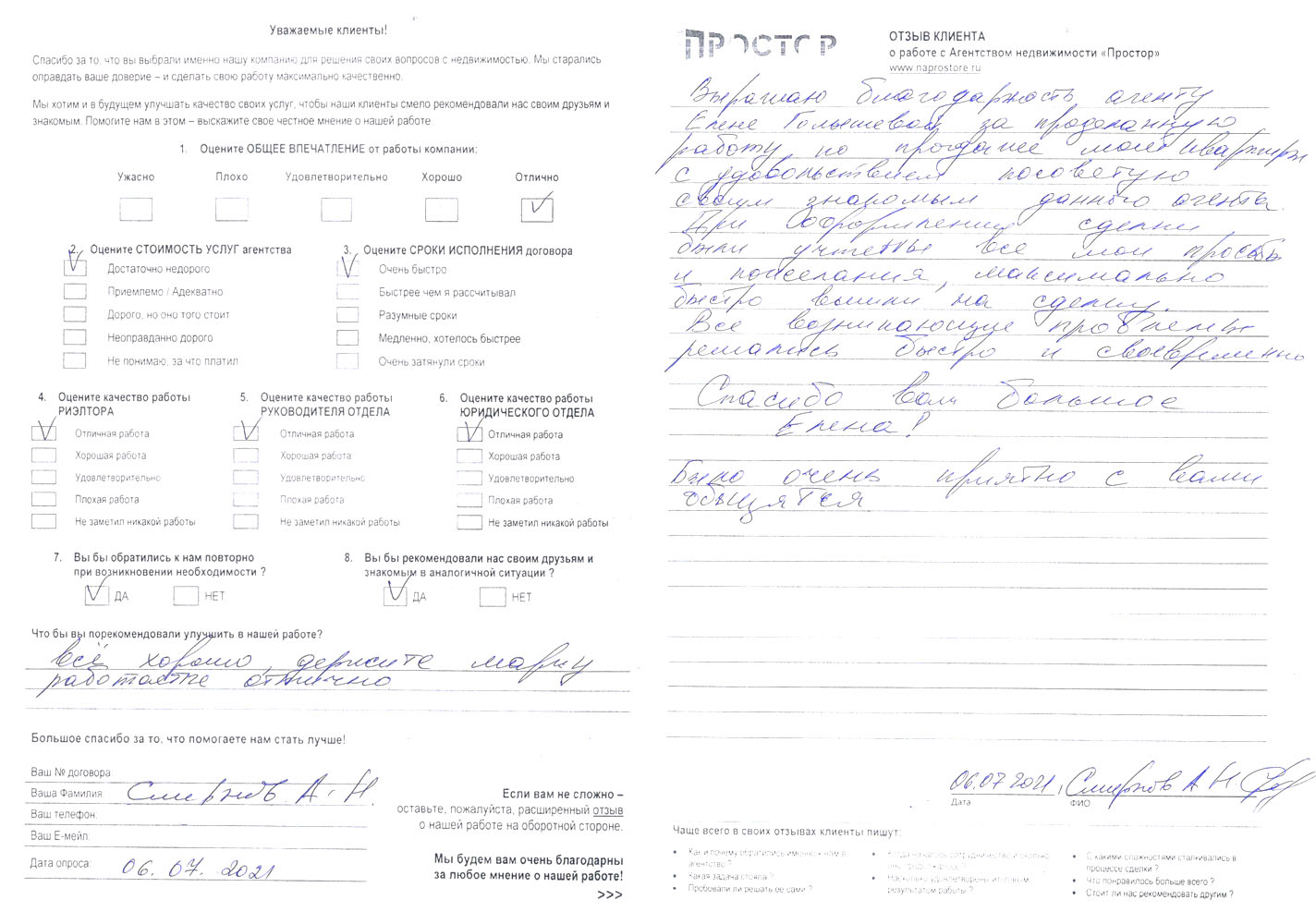 Повторно обратился к АН «Простор», снова все прошло хорошо и я доволен тем, как проходил весь процесс по продаже квартиры. Спасибо Ольге Меньшиковой и Юлии Рощикулиной за проведенную работу! Все прошло быстро, динамично и всегда в контакте по всем вопросам, отдельный большой плюс, что окончательная стоимость продажи получилась даже чуть больше предполагаемой сначала!