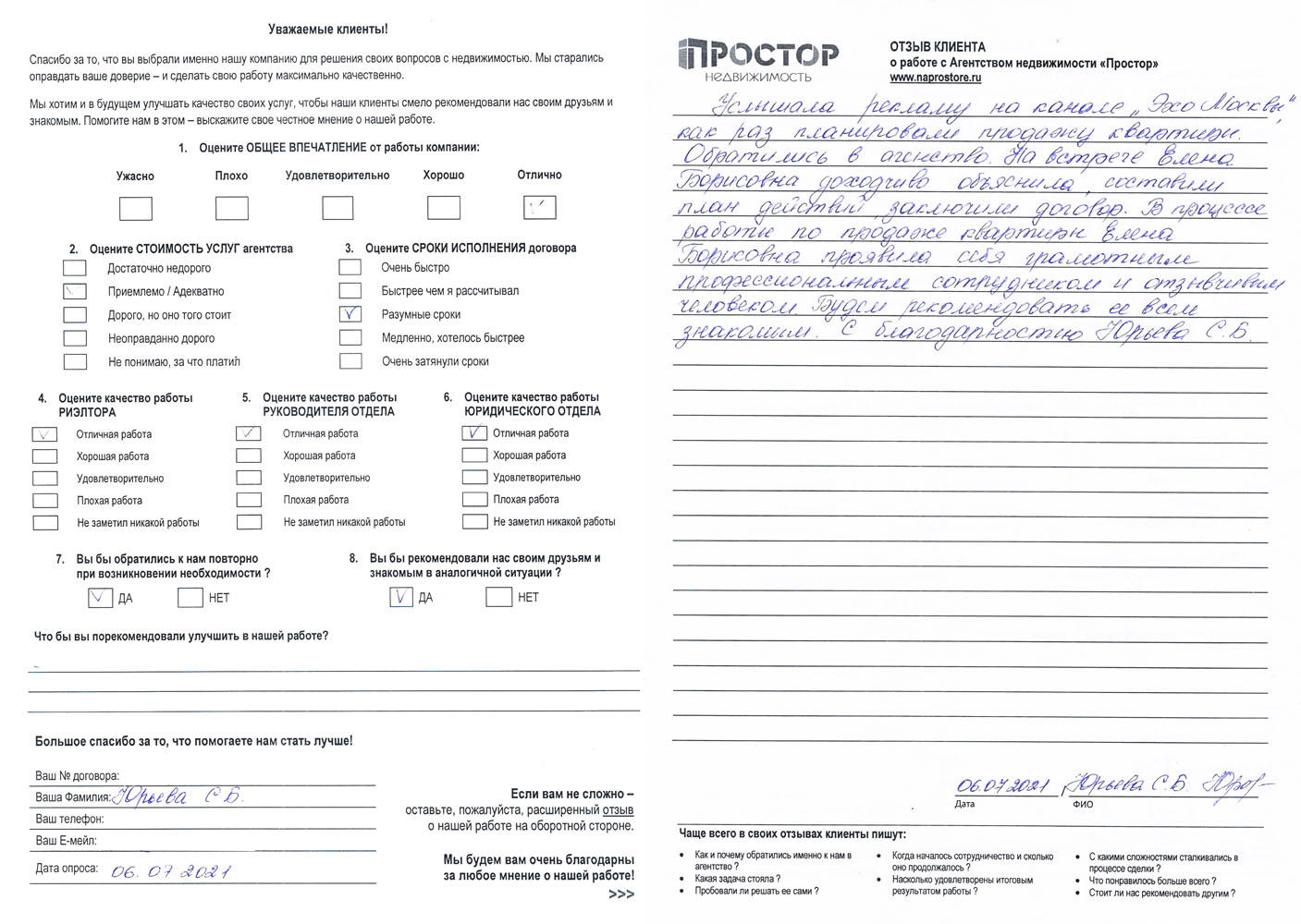 Услышала рекламу на канале» Эхо Москвы», как раз планировали продажу квартиры. Обратились в агентство. На встрече Елена Борисовна доходчиво объяснила, составили план действий, заключили договор. В процессе работы по продаже квартиры Елена Борисовна проявила себя грамотным профессиональным сотрудником и отзывчивым человеком. Будем рекомендовать ее всем знакомым. С благодарностью Юрьева С.Б.