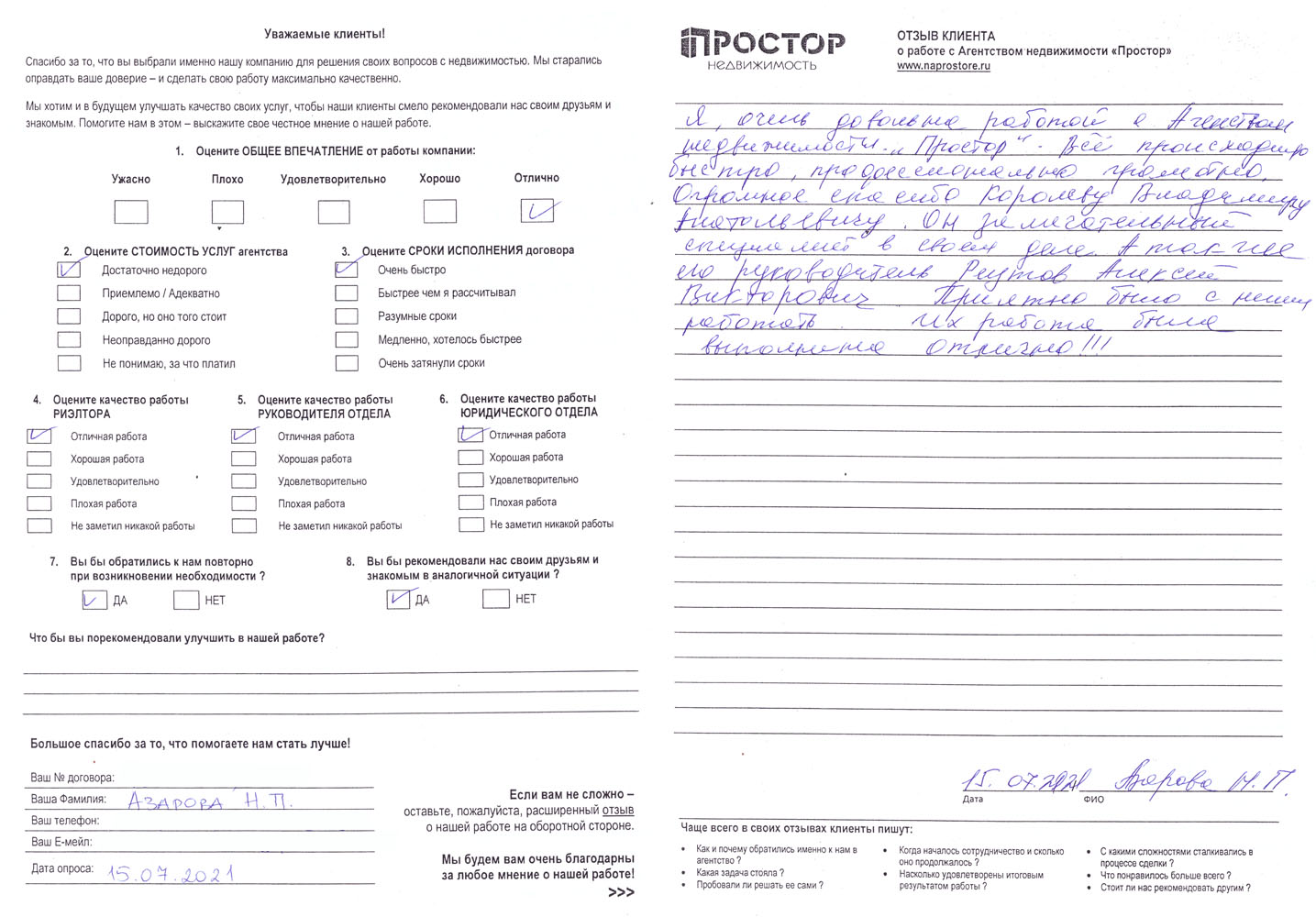 Я очень довольна работой с Агентством недвижимости «Простор». Всё происходило быстро, профессионально, грамотно. Огромное спасибо Королеву Владимиру Анатольевичу. Он замечательный специалист в своем деле. А так же его руководитель Реутов Алексей Викторович. Приятно было с ними работать. Их работа была выполнена отлично!!!