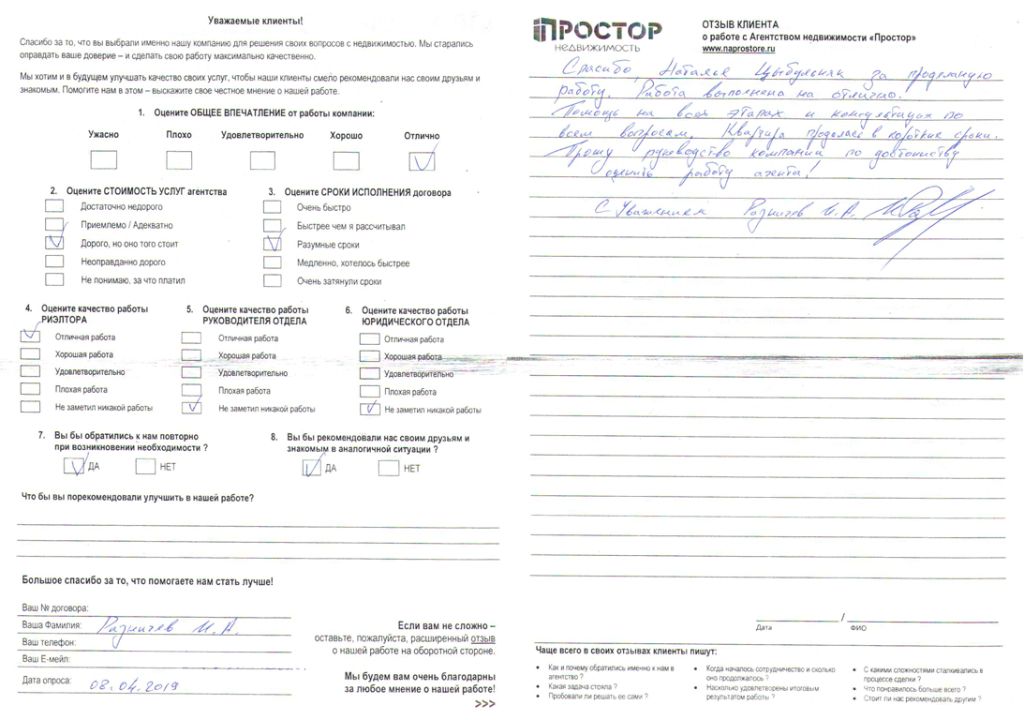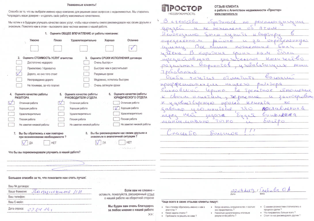Повторно обратился к АН «Простор», снова все прошло хорошо и я доволен тем, как проходил весь процесс по продаже квартиры. Спасибо Ольге Меньшиковой и Юлии Рощикулиной за проведенную работу! Все прошло быстро, динамично и всегда в контакте по всем вопросам, отдельный большой плюс, что окончательная стоимость продажи получилась даже чуть больше предполагаемой сначала!