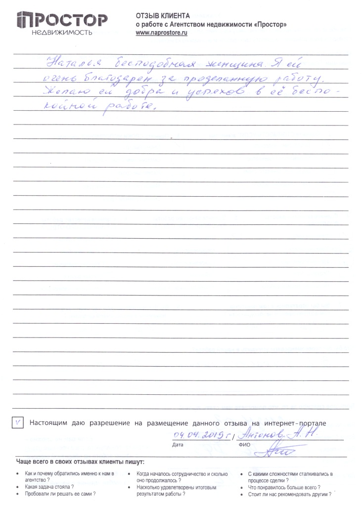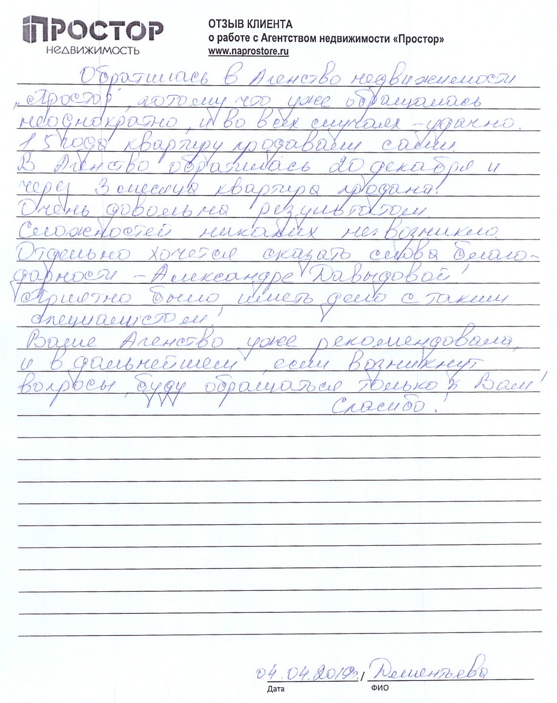 Обратилась в Агентство Недвижимости "ПРОСТОР", потому что уже обращалась неоднократно и во всех случаях - удачно. 1,5 года квартиру продавали сами. В Агентство обратилась 20 декабря и через 3 месяца квартира была продана. Очень довольна результатом. Сложностей никаких не возникло. Отдельно хочется сказать слова благодарности Александре Давыдовой. Приятно было иметь дело с таким специалистом. Ваше агентство уже рекомендовала, и в дальнейшем, если возникнут вопросы, буду обращаться только к Вам! Спасибо!