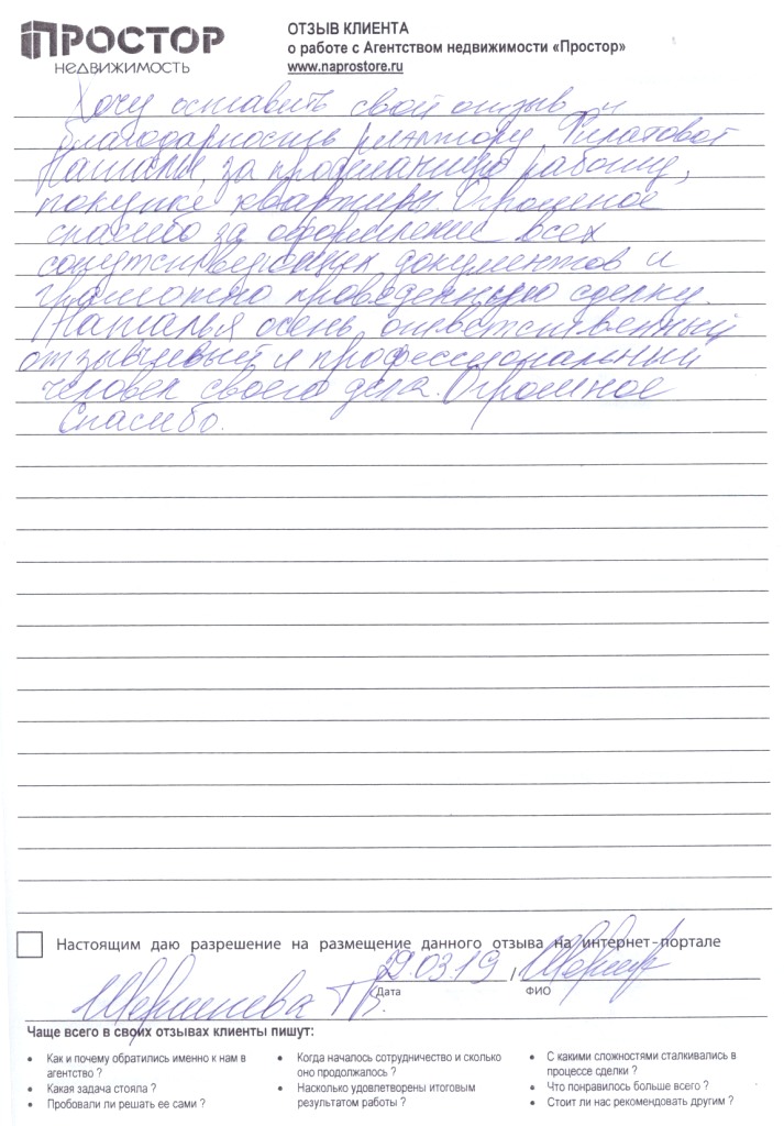 В агентство «Простор», с просьбой помочь приобрести квартиру, обратилась впервые. В результате мне подобрали квартиру в хорошем районе (даже не рассчитывала!!!) и за приемлемую цену очень быстро!!! Хочу поблагодарить Трусову Елену за оперативность, компетентность и личное обаяние, а также начальника отдела Давыдова Дениса Анатольевича, который на протяжении всей сделки принимал личное участие: консультировал, советовал, очень помог на сделке в банке с юридической стороны. Регистрация прошла гладко, все четко, в назначенное время. Приятно иметь дело с людьми, которые знают и делают свою работу хорошо!!! Желаю Вам стабильности и новых клиентов!!!