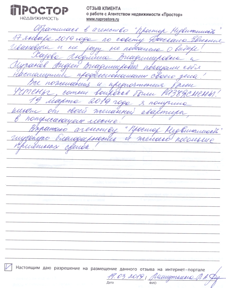 Обратилась в агентство "Простор недвижимость" 17 января 2019 года по совету Даскала Евгения Ивановича и ни разу не пожалела о выборе! Хазова Людмила Владимировна и Муранов Андрей Владимирович показали себя настоящими профессионалами своего дела! Все пожелания и предложения были УЧТЕНЫ, сотни вопросов были РАЗЪЯСНЕНЫ! 19 марта 2019 года, я получила ключи от своей желанной квартиры, в потрясающем месте! Выражаю агентству "Простор недвижимость" глубокую благодарность и желаю побольше приятных сделок!