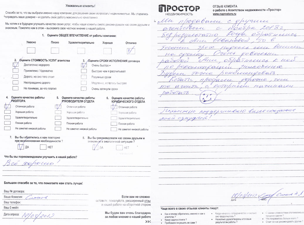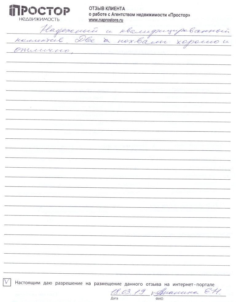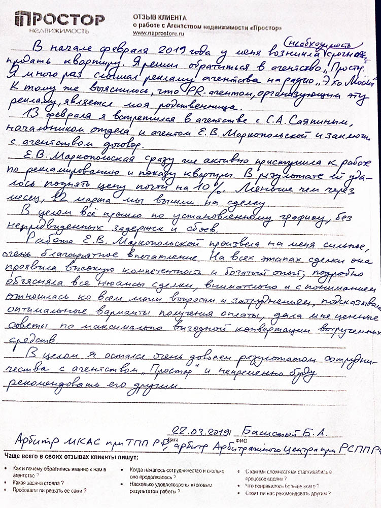 В начале февраля 2019 года у меня возникла необходимость срочно продать квартиру. Я решил обратиться в агентство "Простор". Я много раз слышал рекламу агентства на радио "Эхо Москвы". К тому же выяснилось, что PR-агентом, организующим эту рекламу, является моя родственница. 13 февраля я встретился в агентстве с С.А. Саяпиным, начальником отдела и агентом Е.В.Маркопольской и заключил с агентством договор. Е.В. Маркопольская сразу же активно приступила к работе по рекламированию и показу квартиры. В результате ей удалось поднять цену почти на 10%. Меньше чем через месяц, 12 марта мы вышли на сделку. В целом все прошло по установленному графику, без непредвиденных задержек и сбоев. Работа Е.В. Маркопольской произвела на меня сильное, очень благоприятное впечатление. На всех этапах сделки она проявила высокую компетентность и богатый опыт, подробно объясняла все нюансы сделки, внимательно и с пониманием относилась ко всем моим вопросам и затруднениям, подсказывала оптимальные варианты получения оплаты, дала мне ценные советы по максимально выгодной конвертации вырученных средств. В целом я остался очень доволен результатом сотрудничества с агентством "Простор" и непременно буду рекомендовать его другим.