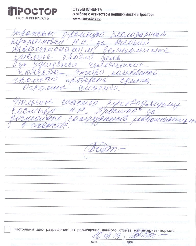 Выражаю огромную благодарность Куприяновой Н.И. за высокий профессионализм, великолепное знание своего дела, за душевные человеческие качества. Быстро, качественно, грамотно проведена сделка. Огромное спасибо. Большое спасибо руководящему составу АН "ПРОСТОР" за достойных сотрудников, работающих в агентстве.