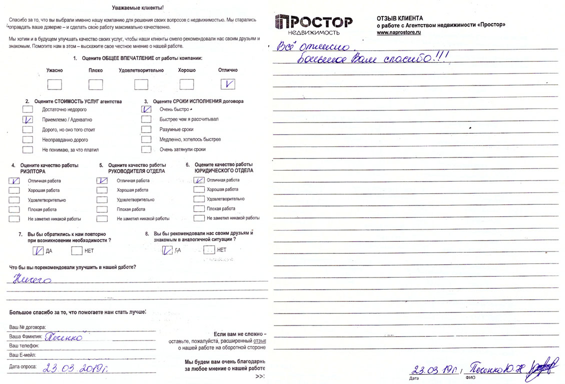 Я, Атаян Нонна Николаевна, являюсь клиентом агентства «Простор», работаем с агентом Ольгой Меньшиковой. Спасибо Вам огромное за четкую и оперативную работу. Вопрос решили четко; с оформлением справились также оперативно. Были учтены все наши пожелания и возможности. Рекомендую всем такого чуткого и отзывчивого сотрудника. Обязательно буду рекомендовать всем своим близким и знакомым. Изначально я сомневалась, что вообще это реально и возможно, так как были некоторые сложности с нашей стороны, а Ольга все так четко и конструктивно объяснила, а также просто вселила надежду, и всё получилось, в общем сделала невозможное возможным. Спасибо Вам огромное!!!