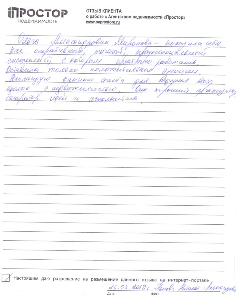 Ольга Александровна Миронова показала себя как оперативный, точный, профессиональный специалист, с которым приятно работать. Оставила только положительные эмоции. Рекомендую данного агента для ведения всех сделок с недвижимостью. Она хороший организатор, генератор идей и исполнитель.