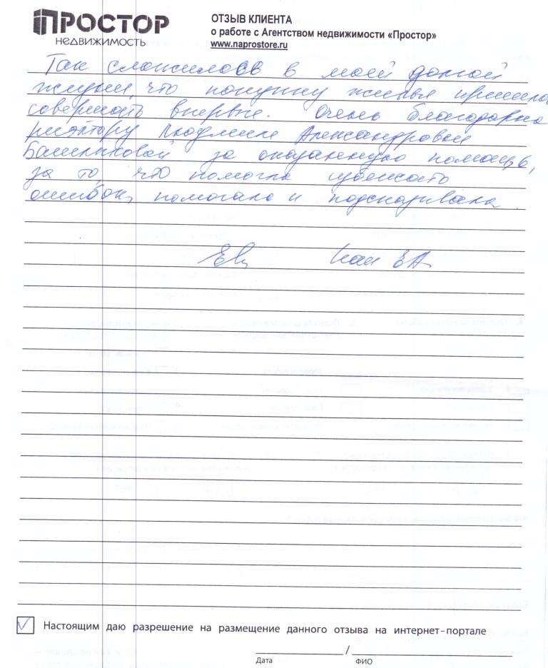 Хочу публично выразить благодарность агентству "Простор" отд. Цветной бульвар в целом, Лоле Эмильевне Эйтвин и Юлии Владимировне Лурье отдельно за удачно завершенную сделку по продаже нашей квартиры. Начальные данные: Был 2к квартира (на самом деле полуторка 41 квм с маленькой "маленькой" комнатой, небольшой кухней и совмещенным СУ) в панельной 9ти этажке в Подольске. Задача стояла как чистая продажа, т.к. квартирой не пользовалась и прописанных не было. Цель: Получить деньги и с доплатой купить другую квартиру в Подольске с улучшенными характеристиками. По процессу продажи и реализации сделки: С самого начала обсудили и согласовали план реализации задуманного. Лола и Юлия порекомендовали оптимальную стратегию и последовательность. Далее рутина - звонки, показы. Правда эта рутина немного затянулась (продавали больше полугода), но связываю это с характеристиками самого объекта. Как уже писала выше квартира с нестандартными параметрами и к тому же недавнем наследством. А в Подольске сейчас построен новый район, Кузнечики, в котором новострой большей площади отдают недорого относительно старых обжитых районов. Лола всегда была на связи, сообщала о колебаниях в интересе к квартире, исходя из чего мы корректировали ценник. Сама же сделка прошла для нас более чем комфортно, приехали в банк (у покупателя была ипотека) подписали документы, разъехались. Предварительной подготовкой занималось агентство, нас не беспокоя, согласовывая только ключевые моменты. Деньги на счет в банке после регистрации собственности. Сейчас той же командой работаем над второй частью - покупка другой квартиры. Лола, Юлия еще раз СПАСИБО. http://forum.ners.ru/viewtopic.php?f=91&t=40323
