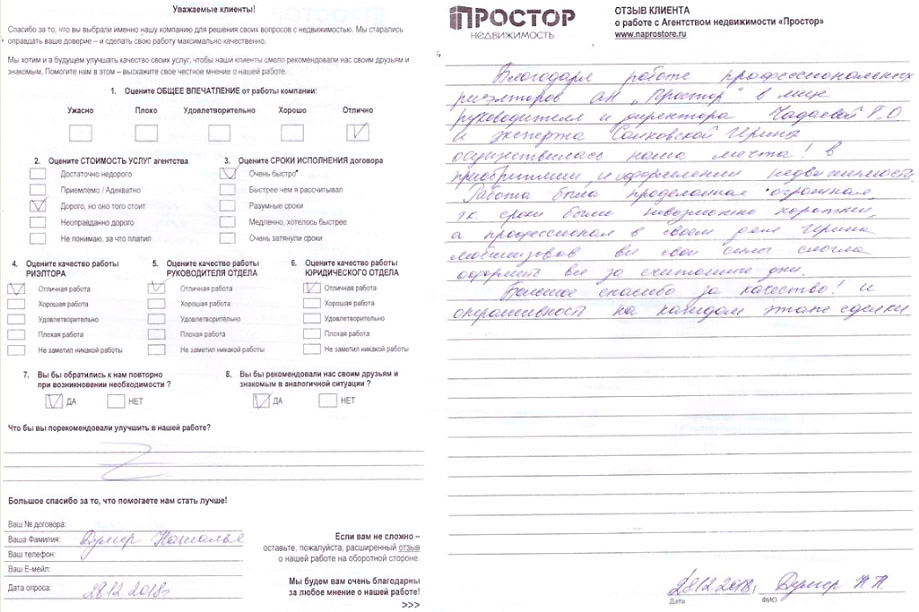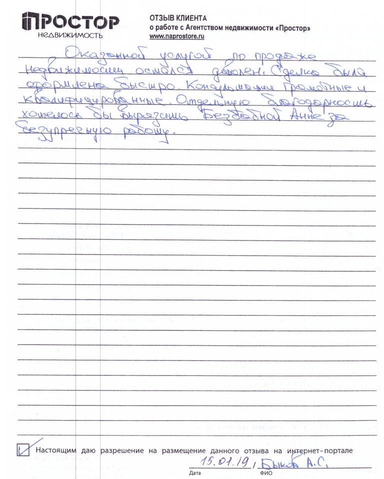 Повторно обратился к АН «Простор», снова все прошло хорошо и я доволен тем, как проходил весь процесс по продаже квартиры. Спасибо Ольге Меньшиковой и Юлии Рощикулиной за проведенную работу! Все прошло быстро, динамично и всегда в контакте по всем вопросам, отдельный большой плюс, что окончательная стоимость продажи получилась даже чуть больше предполагаемой сначала!