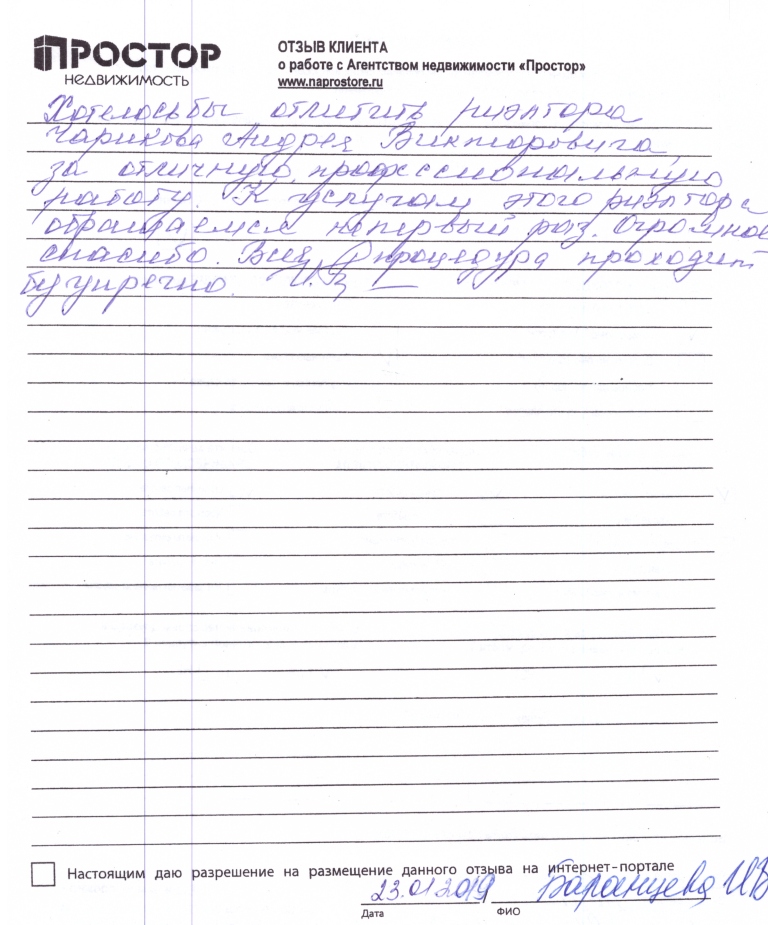 Хотелось бы отличить риэлтора Чарикова Андрея Викторовича, за отличную, профессиональную работу. К услугам этого риэлтора обращаемся не первый раз. Огромное спасибо! Вся процедура проходит безупречно.