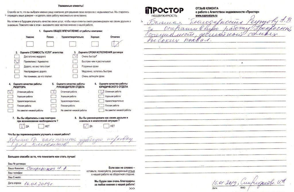 Почти у каждого человека хоть раз в жизни возникает вопрос купли-продажи недвижимости, но далеко не каждый готов к этому событию и морально, и информационно. В числе таких неподготовленных граждан однажды оказалась и я. Варианты «была, ни была» и «авось» меня никак не устраивали. Гигабайты информации в интернете были проштудированы, миллионы постов на форумах прочитаны, оставался самый важный момент этого предприятия – поиск подходящего агентства недвижимости. Был составлен немаленький список обзвона, и процесс пошел. В каждом агентстве мне сулили золотые горы и коньки в придачу, но как-то все не верилось. В агентстве недвижимости «ПРОСТОР» никаких «гор» мне обещать не стали, оперативно и объективно оценили мою квартиру. Агент Аркадий Каргинов четко и по пунктам объяснил мне процесс сделки... и не один раз... так как с первого раза, и даже со второго я мало что поняла и запомнила. Было еще много вопросов, и все они не оставались без внимания и понятных для меня ответов. Аркадий был всегда на связи и готов помочь, каждую неделю я получала краткое резюме наших с ним переговоров и подробное описание процесса поиска покупателя. Грамотный, компетентный, всегда вежливый и приятный в общении – агентство «ПРОСТОР» может по праву гордиться таким сотрудником. Особенно порадовало тот факт, что обещанное перед подписанием договора с агентством, и итог при завершении сделки совпали в самых мелких подробностях, никаких доплат, раннее не оговоренных не случилось, и на протяжении всего процесса ни в коей мере не навязывалось. В результате, предприятие, сулившее до обращения в это агентство бессонные ночи, расшатанные нервы и потерю кучи времени обернулось приятным познавательным процессом. Без сомнения, Аркадия Каргинова ждет большое будущее в мире недвижимости, чего я и моя семья от всей души ему желаем. Подписываясь под каждым словом, Анастасия Хенох.