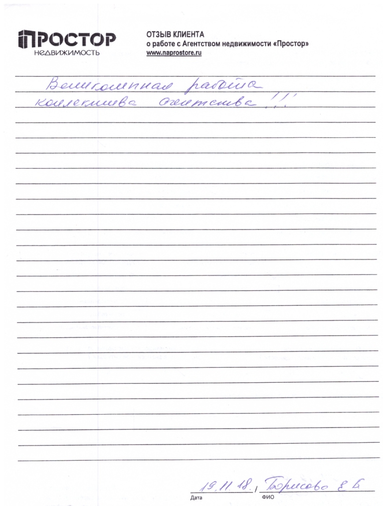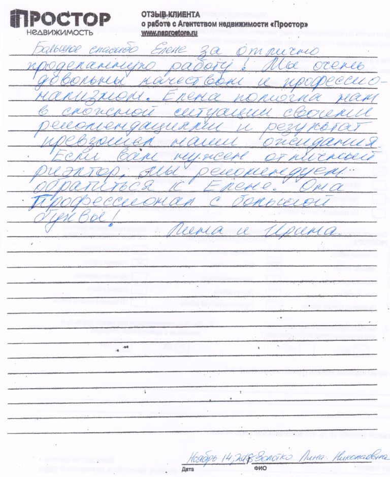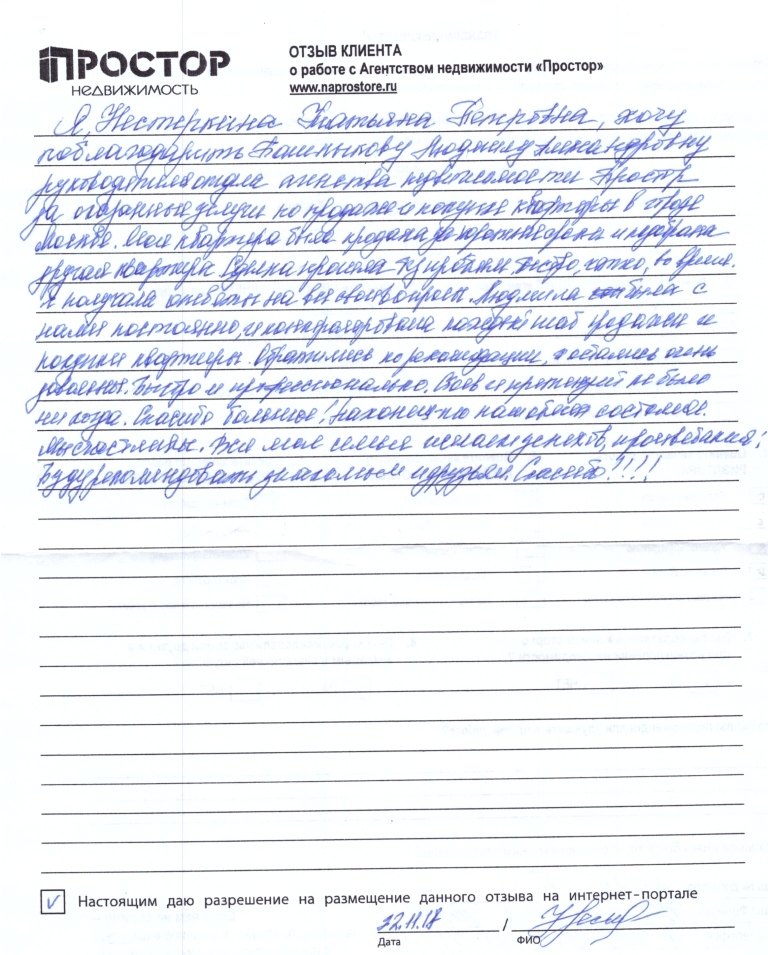 Я, Нестеркина Татьяна Петровна, хочу поблагодарить Башлыкову Людмилу Александровну, руководителя отдела агентства недвижимости Простор за оказанные услуги продаже и купле квартиры в городе Москве. Моя квартира была продана в хорошие сроки и подобрана другая квартира. Сделка прошла без проблем, быстро, четко, во время. Я получала ответы на все свои вопросы. Людмила была с нами постоянно, и контролировала каждый шаг продажи и покупки квартиры. Обратились по рекомендации, остались очень довольны. Быстро и профессионально. Сбоев и претензий не было никогда. Спасибо большое! Наконец-то наш обмен состоялся. Мы счастливы. Вся моя семья желает успехов, процветания. Буду рекомендовать знакомым и друзьям. Спасибо!!!