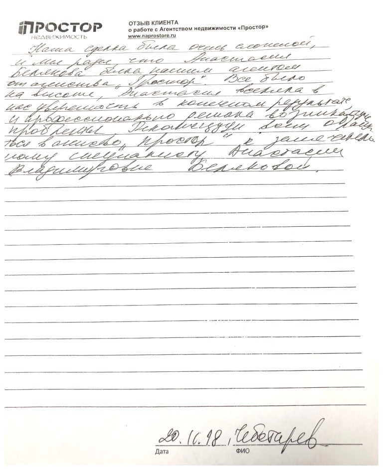 Наша сделка была очень сложной, и мы рады, что Анастасия Белякова была нашим агентом от агентства "Простор". Все было на высоте, Анастасия вселяла в нас уверенность в конечном результате и профессионально решала возникающие проблемы. Рекомендую всем обращаться в агентство "Простор" к замечательному специалисту Анастасии Владимировне Беляковой.