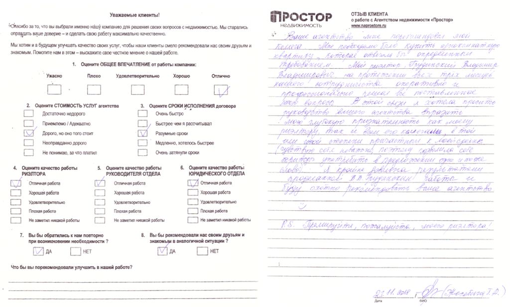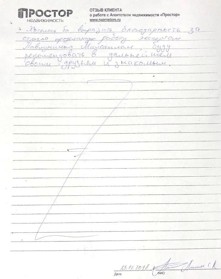 Повторно обратился к АН «Простор», снова все прошло хорошо и я доволен тем, как проходил весь процесс по продаже квартиры. Спасибо Ольге Меньшиковой и Юлии Рощикулиной за проведенную работу! Все прошло быстро, динамично и всегда в контакте по всем вопросам, отдельный большой плюс, что окончательная стоимость продажи получилась даже чуть больше предполагаемой сначала!