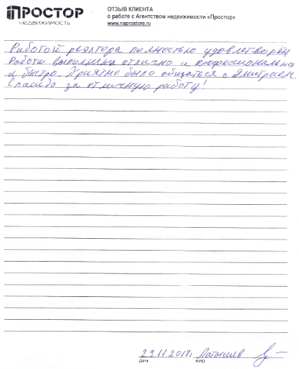 Работой риэлтора полностью удовлетворен. Работа выполнена отлично и профессионально, и быстро. Приятно было общаться с Дмитрием. Спасибо за отличную работу!