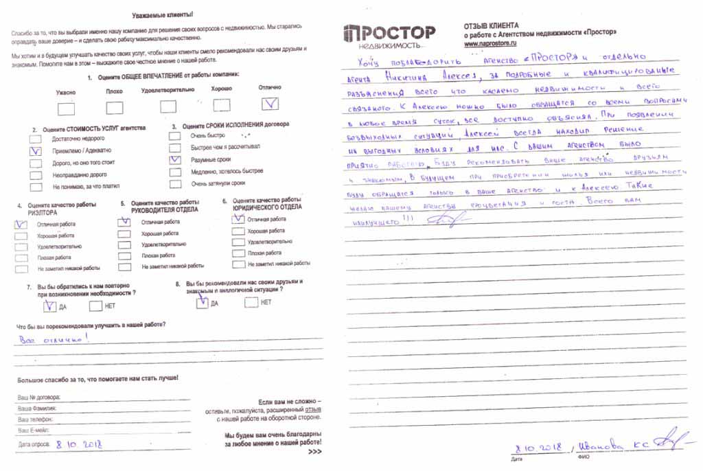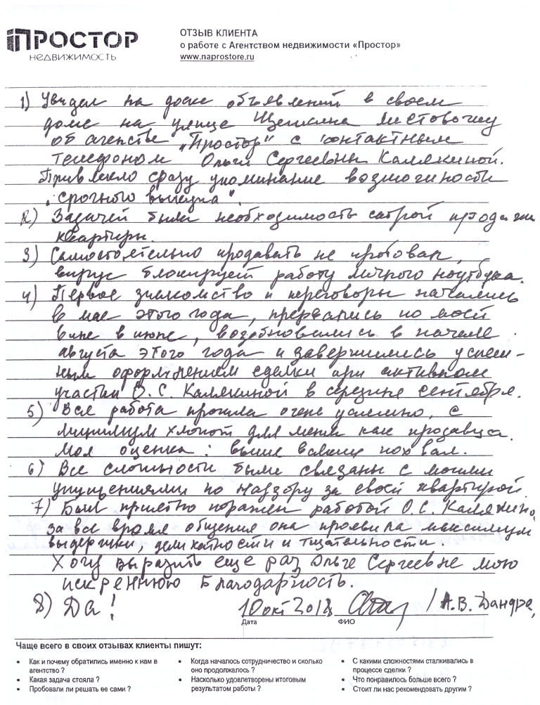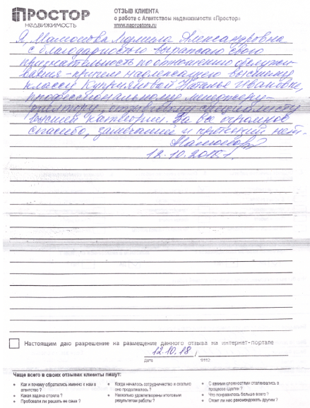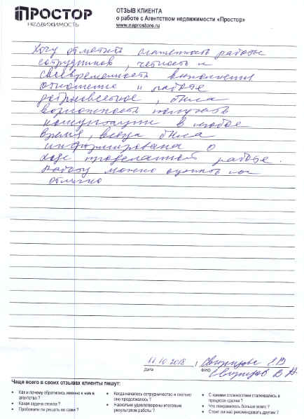 Я, Атаян Нонна Николаевна, являюсь клиентом агентства «Простор», работаем с агентом Ольгой Меньшиковой. Спасибо Вам огромное за четкую и оперативную работу. Вопрос решили четко; с оформлением справились также оперативно. Были учтены все наши пожелания и возможности. Рекомендую всем такого чуткого и отзывчивого сотрудника. Обязательно буду рекомендовать всем своим близким и знакомым. Изначально я сомневалась, что вообще это реально и возможно, так как были некоторые сложности с нашей стороны, а Ольга все так четко и конструктивно объяснила, а также просто вселила надежду, и всё получилось, в общем сделала невозможное возможным. Спасибо Вам огромное!!!