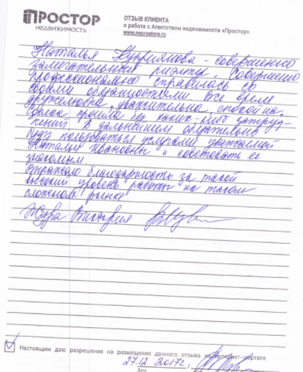 Я, Атаян Нонна Николаевна, являюсь клиентом агентства «Простор», работаем с агентом Ольгой Меньшиковой. Спасибо Вам огромное за четкую и оперативную работу. Вопрос решили четко; с оформлением справились также оперативно. Были учтены все наши пожелания и возможности. Рекомендую всем такого чуткого и отзывчивого сотрудника. Обязательно буду рекомендовать всем своим близким и знакомым. Изначально я сомневалась, что вообще это реально и возможно, так как были некоторые сложности с нашей стороны, а Ольга все так четко и конструктивно объяснила, а также просто вселила надежду, и всё получилось, в общем сделала невозможное возможным. Спасибо Вам огромное!!!