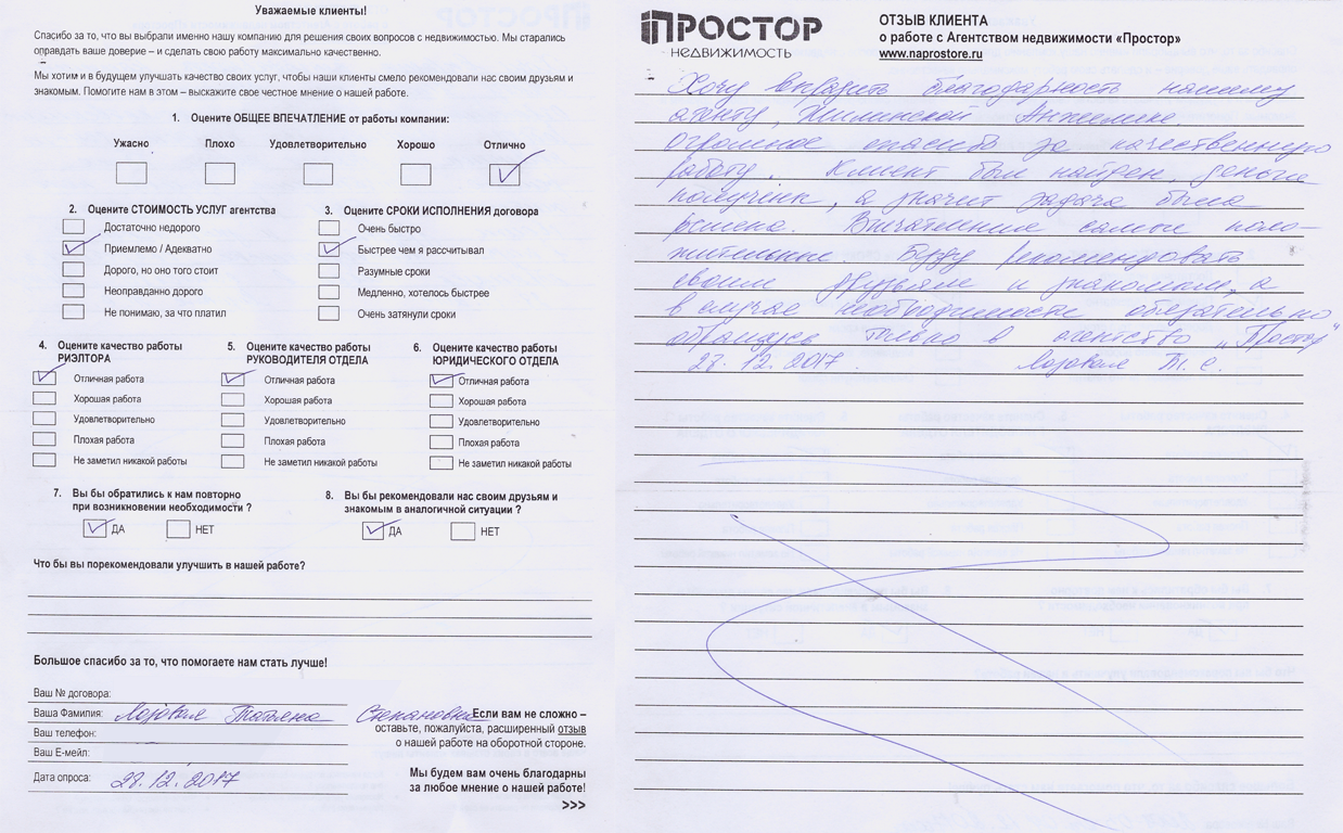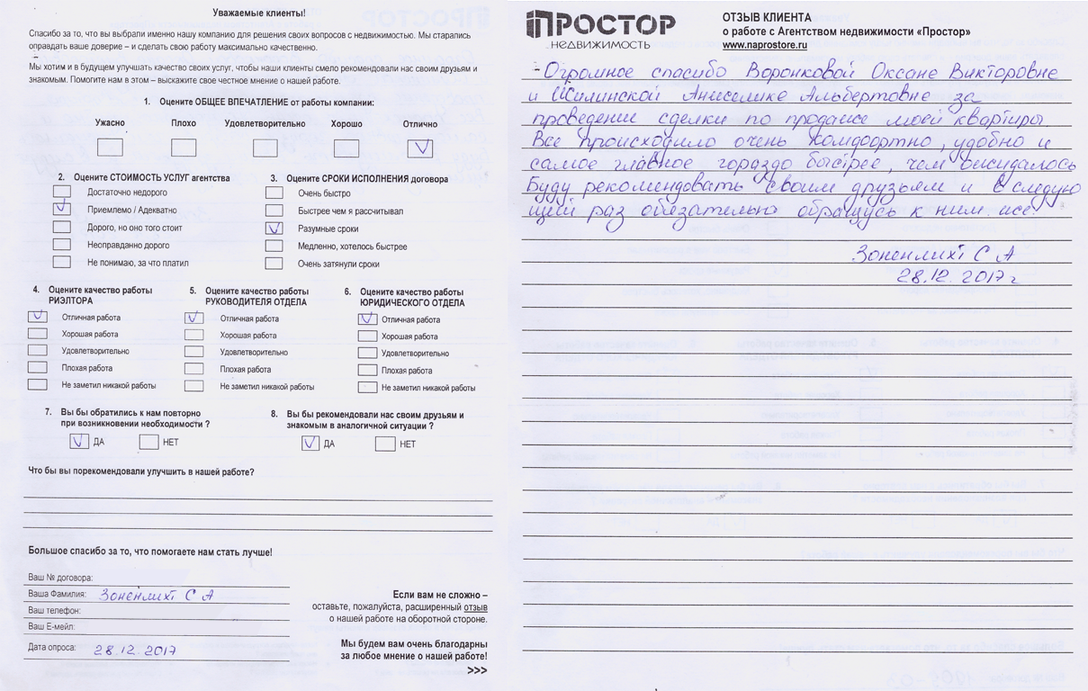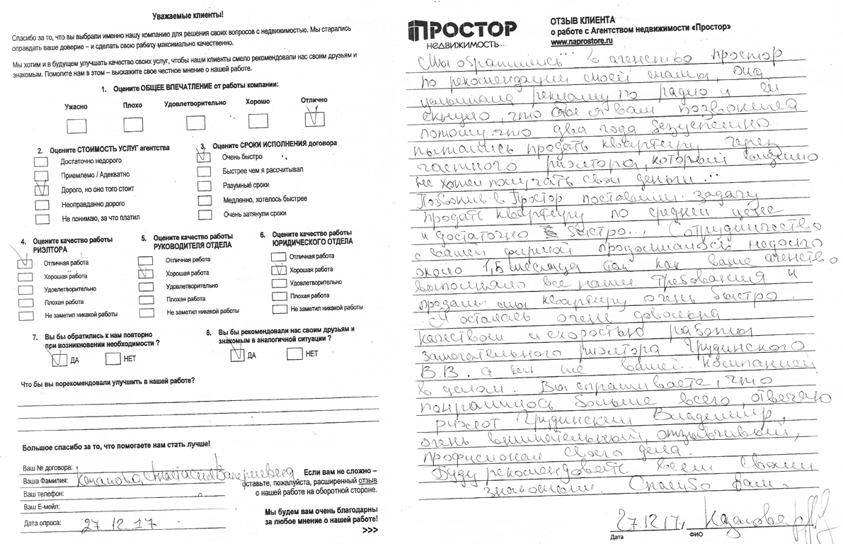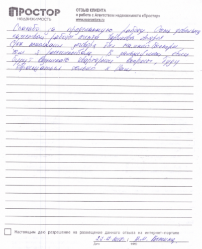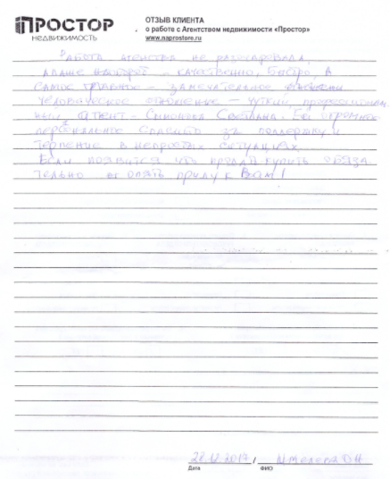 Мы обратились в агентство "Простор" по рекомендации моей мамы. Она услышала рекламу по радио, и ей екнуло, чтобы я вам позвонила, потому что два года безуспешно пытались продать квартиру через частного риэлтора, который, видимо, не хотел получать свои деньги. Позвонив в "Простор", поставили задачу продать квартиру по средней цене и достаточно быстро... Сотрудничество с вашей фирмой продолжалось недолго - около полутора месяцев, так как ваше агентство выполняло все наши требования, и продали мы квартиру очень быстро. Я осталась очень довольна качеством и скоростью работы замечательного риэлтора Грудинского В.В., а также вашей компанией в целом. Вы спрашиваете, что понравилось больше всего. Отвечаю: риэлтор Грудинский Владимир, очень внимательный, отзывчивый, профессионал своего дела. Буду рекомендовать всем своим знакомым. Спасибо вам.