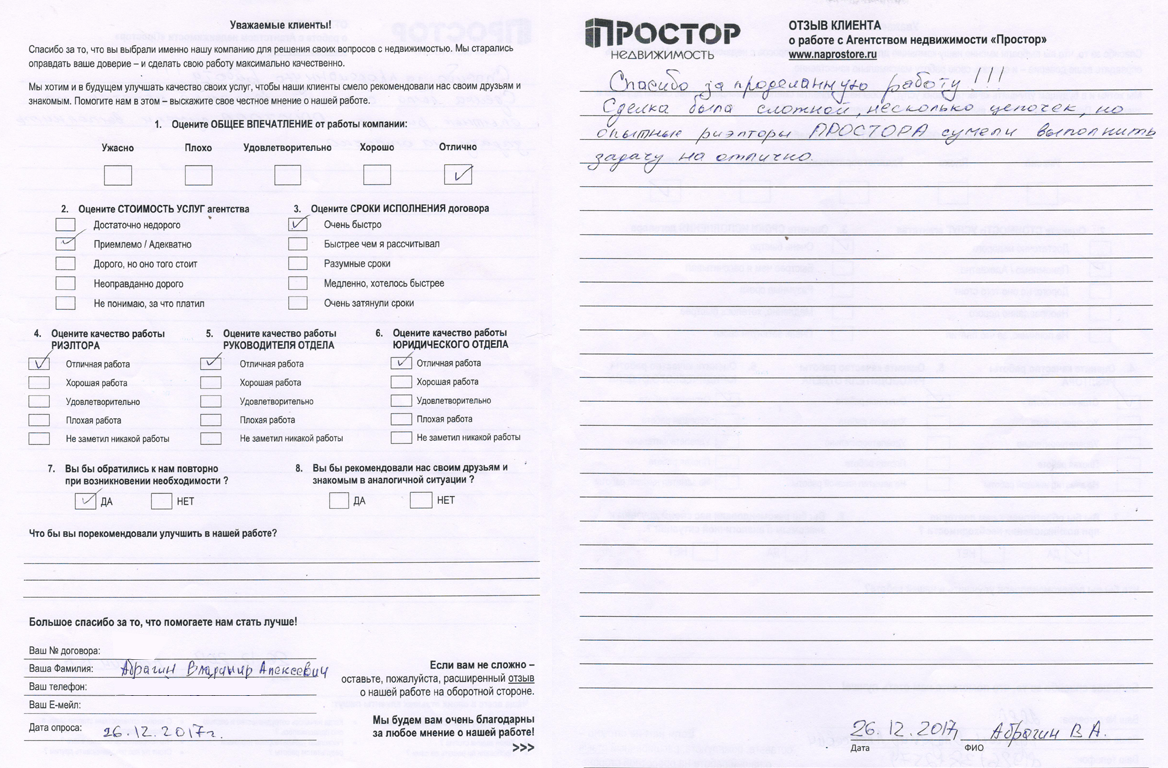 Хочу выразить благодарность нашему агенту Жилинской Анжелике. Огромное спасибо за качественную работу. Клиент был найден, деньги получены, а значит задача была решена. Впечатления самые положительные. Буду рекомендовать своим друзьям и знакомым, а в случае необходимости обязательно обращусь только в агентство "Простор"