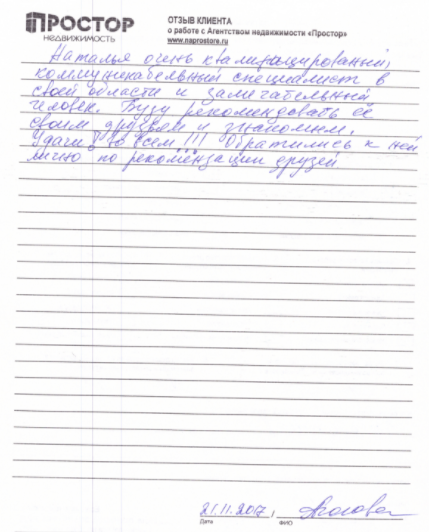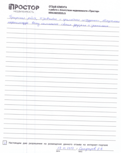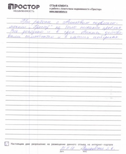 Агентство недвижимости "Простор" показало отличную работу в области продажи и компетентной юридической помощи. Особое внимание и благодарность выражаю агенту Зейнуллиной О.В., как оперативному и высококлассному специалисту в области риэлторской деятельности, умеющей найти индивидуальный подход к каждому клиенту.