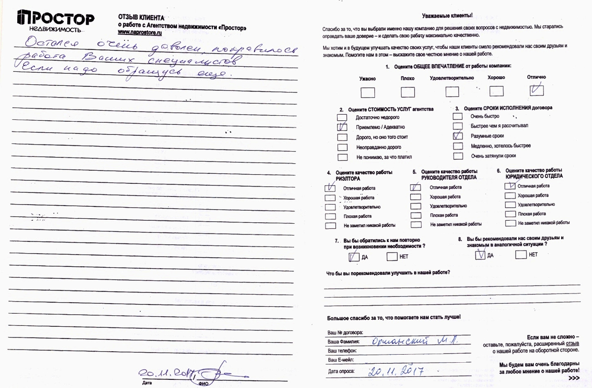 Повторно обратился к АН «Простор», снова все прошло хорошо и я доволен тем, как проходил весь процесс по продаже квартиры. Спасибо Ольге Меньшиковой и Юлии Рощикулиной за проведенную работу! Все прошло быстро, динамично и всегда в контакте по всем вопросам, отдельный большой плюс, что окончательная стоимость продажи получилась даже чуть больше предполагаемой сначала!