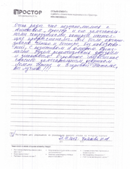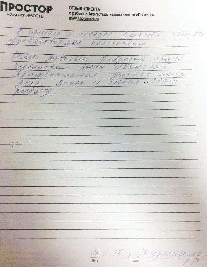 По рекомендации обратился в агентство недвижимости "Простор" с целью продажи квартиры в МО. Хочу поблагодарить сотрудников агентства Маркопольскую Евгению и Рыскину Надежду за отличную организацию процесса.